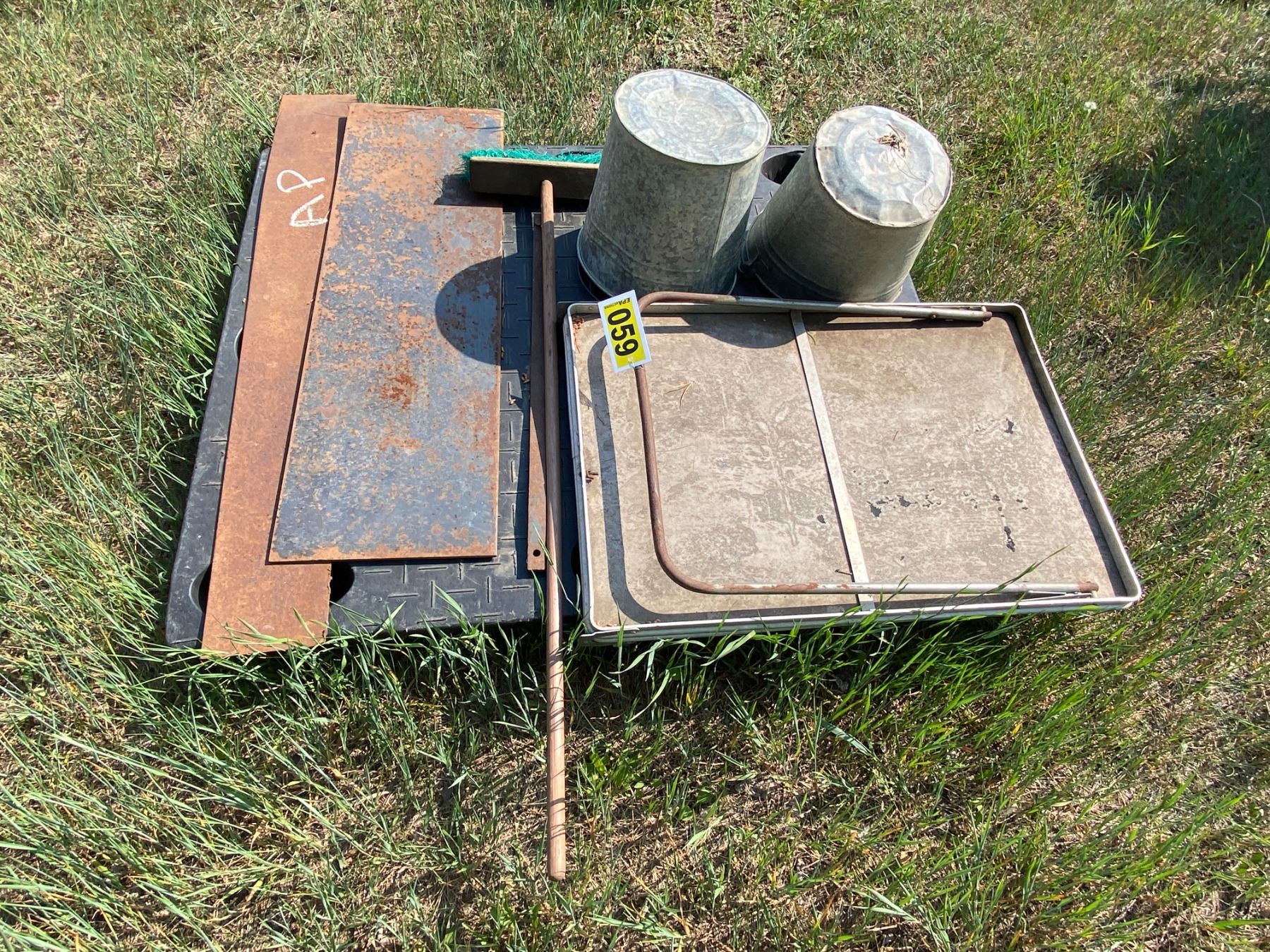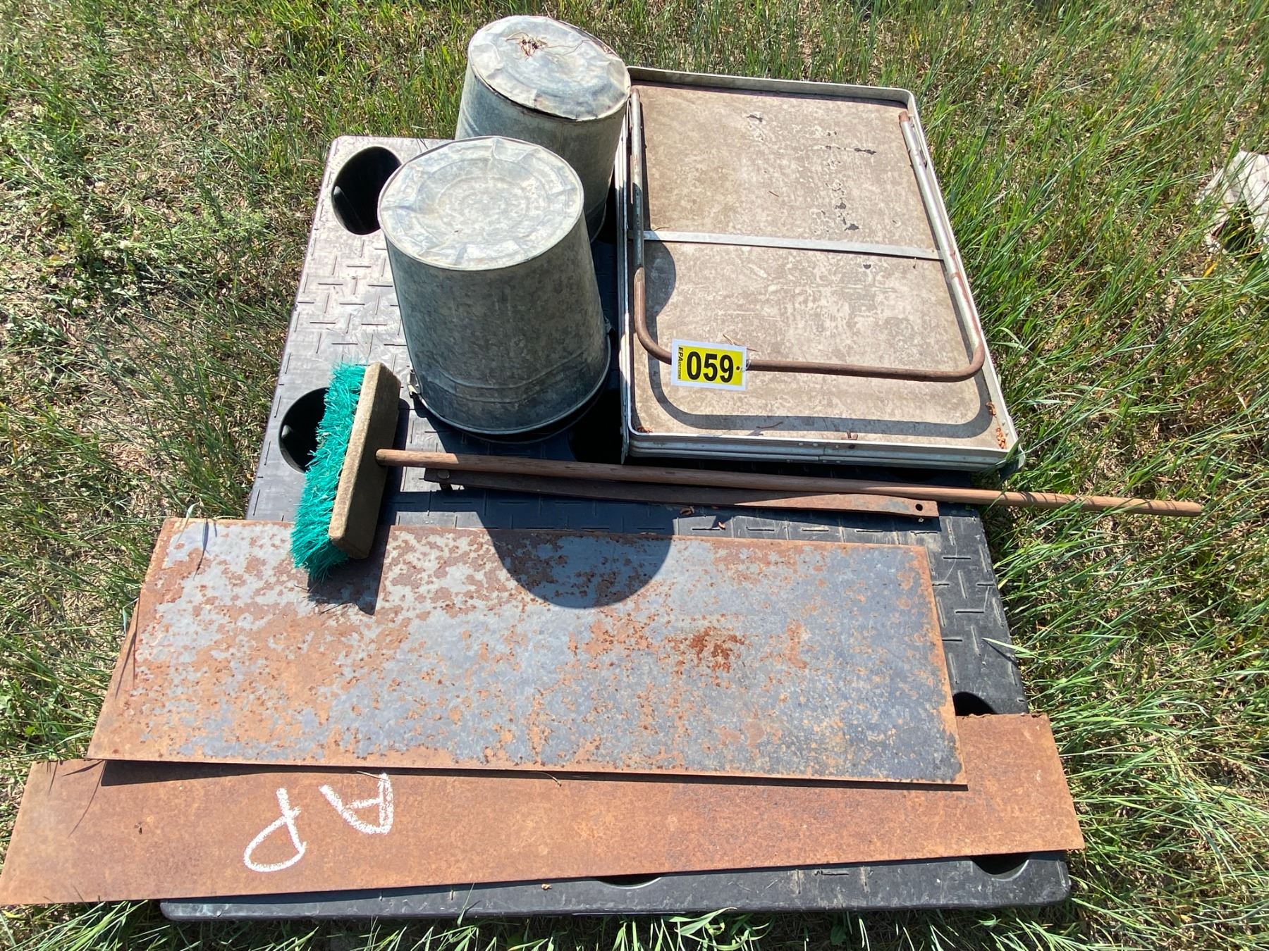 AP Misc., Steel Plating, 2 Pails, broom, folding table