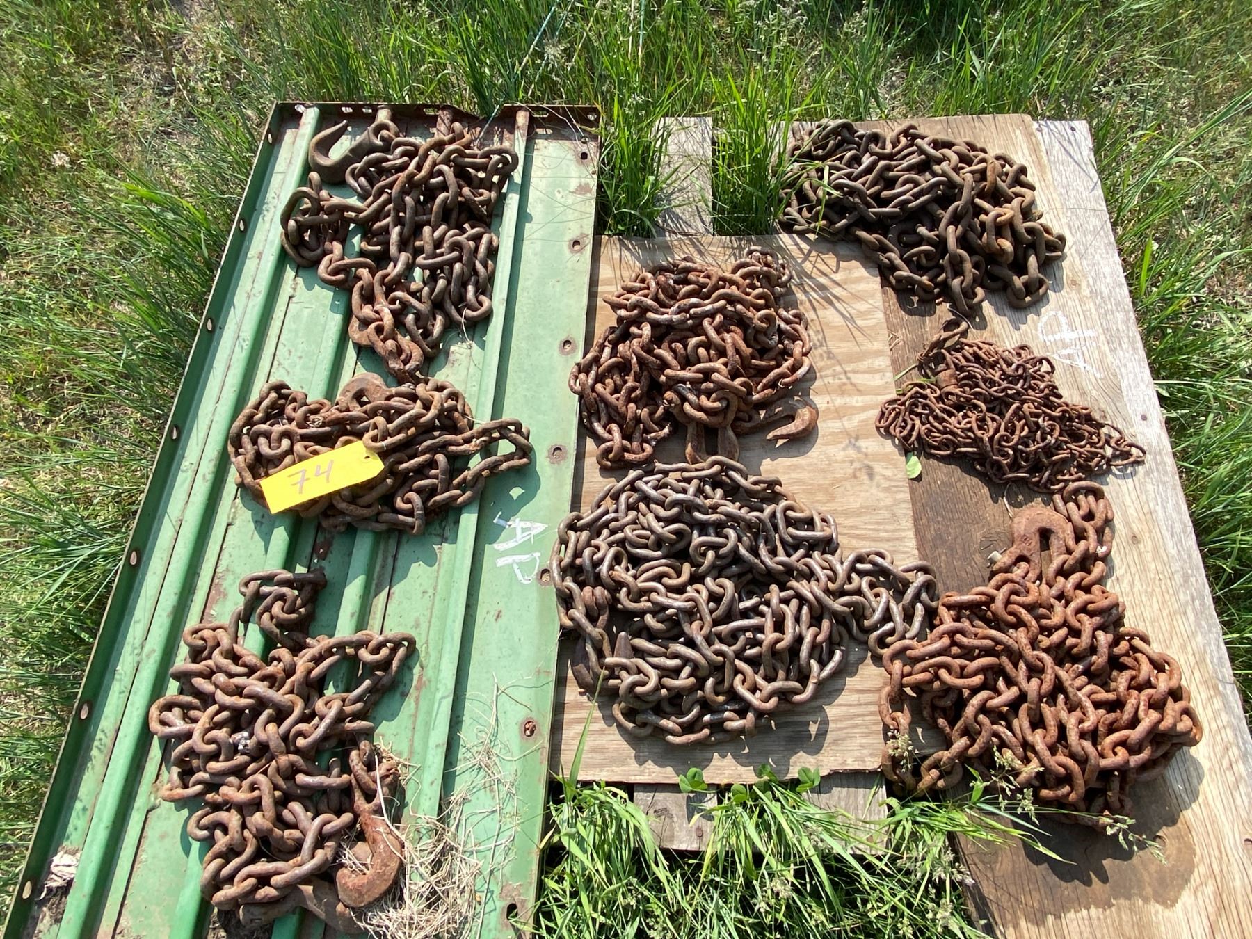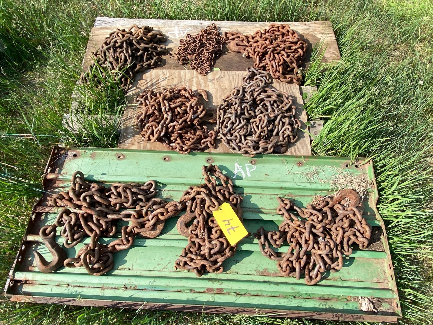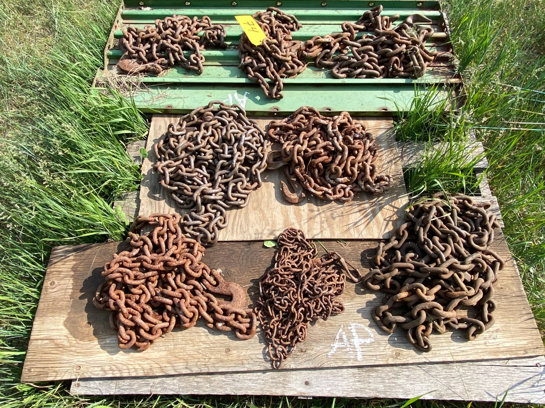 AP Pallet of assorted sizes of various chains & a metal green plate