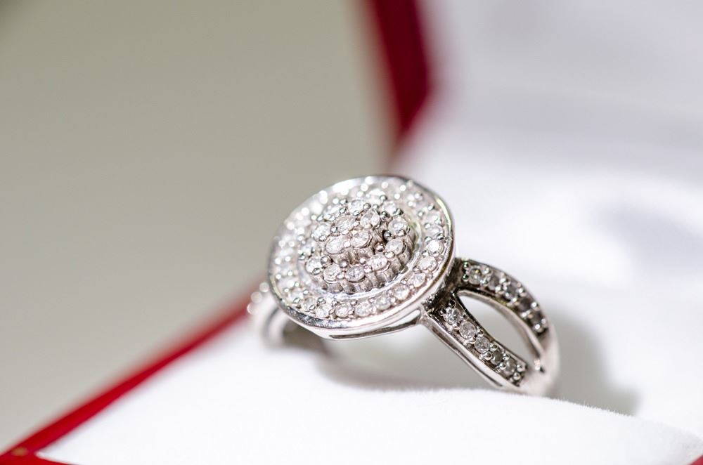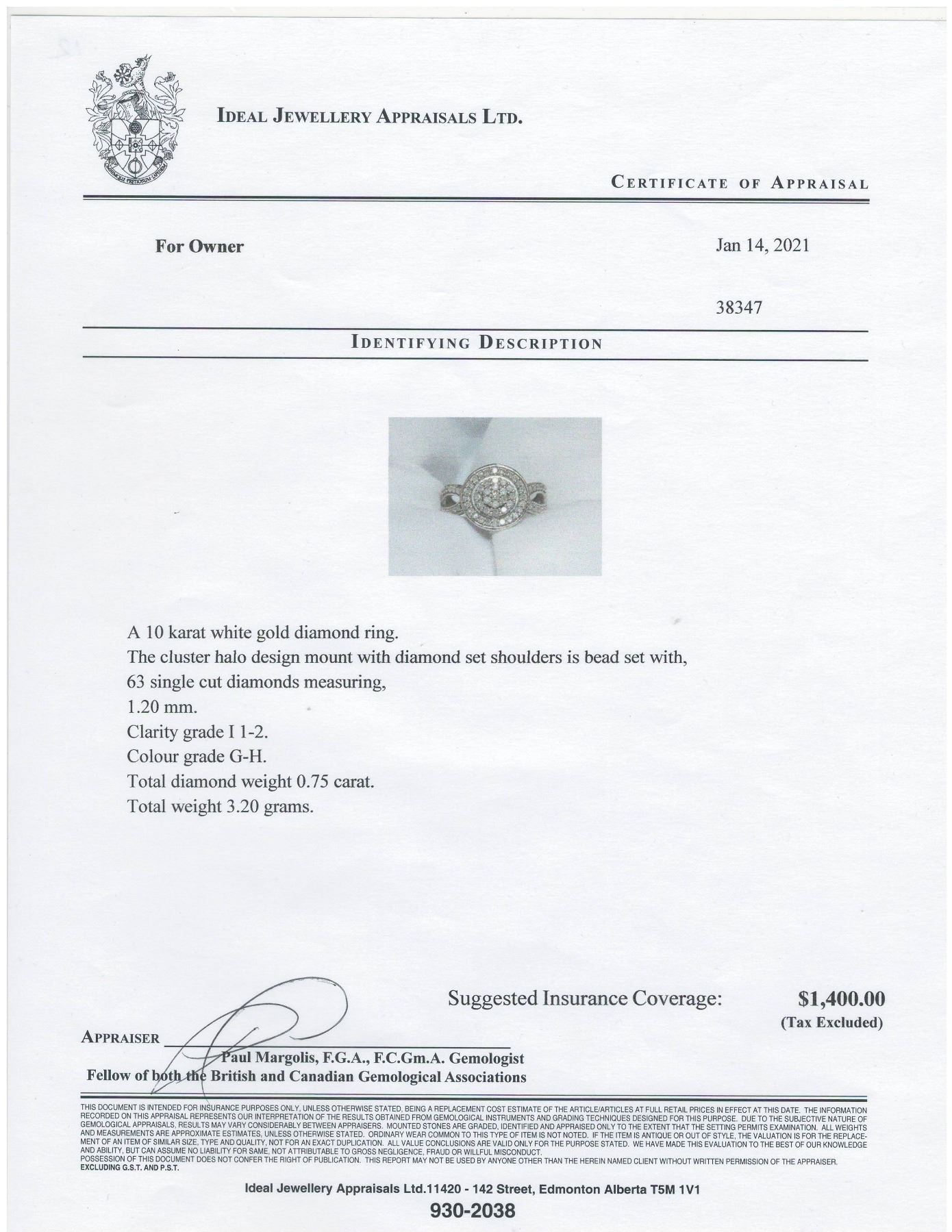THE CLUSTER HALO DESIGN MOUNT WITH DIAMOND SET SHOULDERS IS BEAD SET WITH 63 SINGLE CUT DIAMONDS MEASURING 1.20 MM., CLARITY GRADE I 1-2., COLOUR GRADE G-H. TOTAL DIAMOND WEIGHT 0.75 CARAT. TOTAL WEIGHT 3.20 GRAMS. COMES WITH CERTIFICATE OF APPRAISAL FROM LOCAL APPRAISER, SUGGESTED INSURANCE COVERAGE $1400.00. JEWELLERY