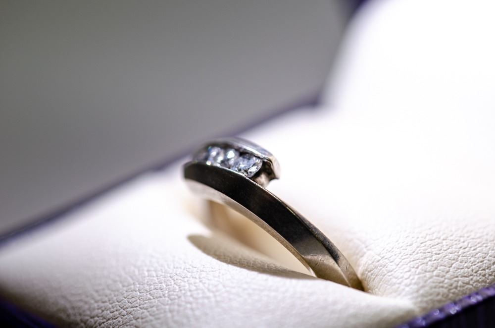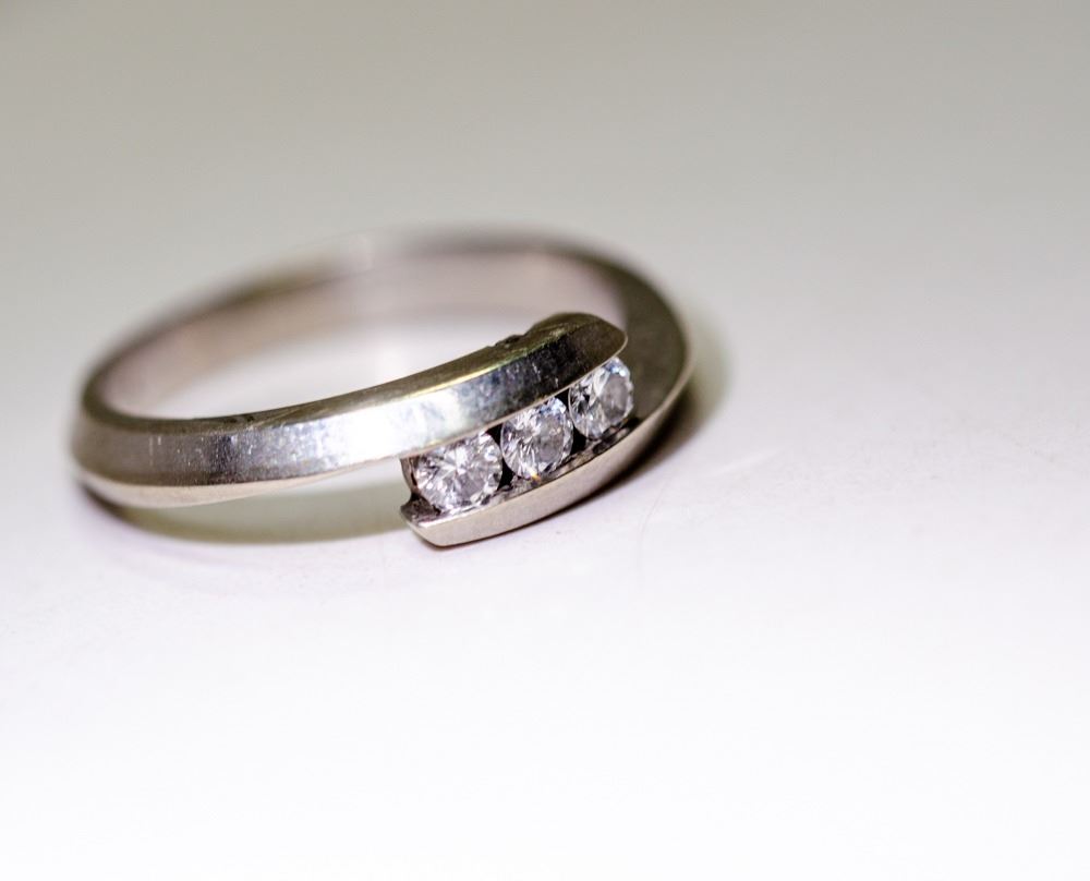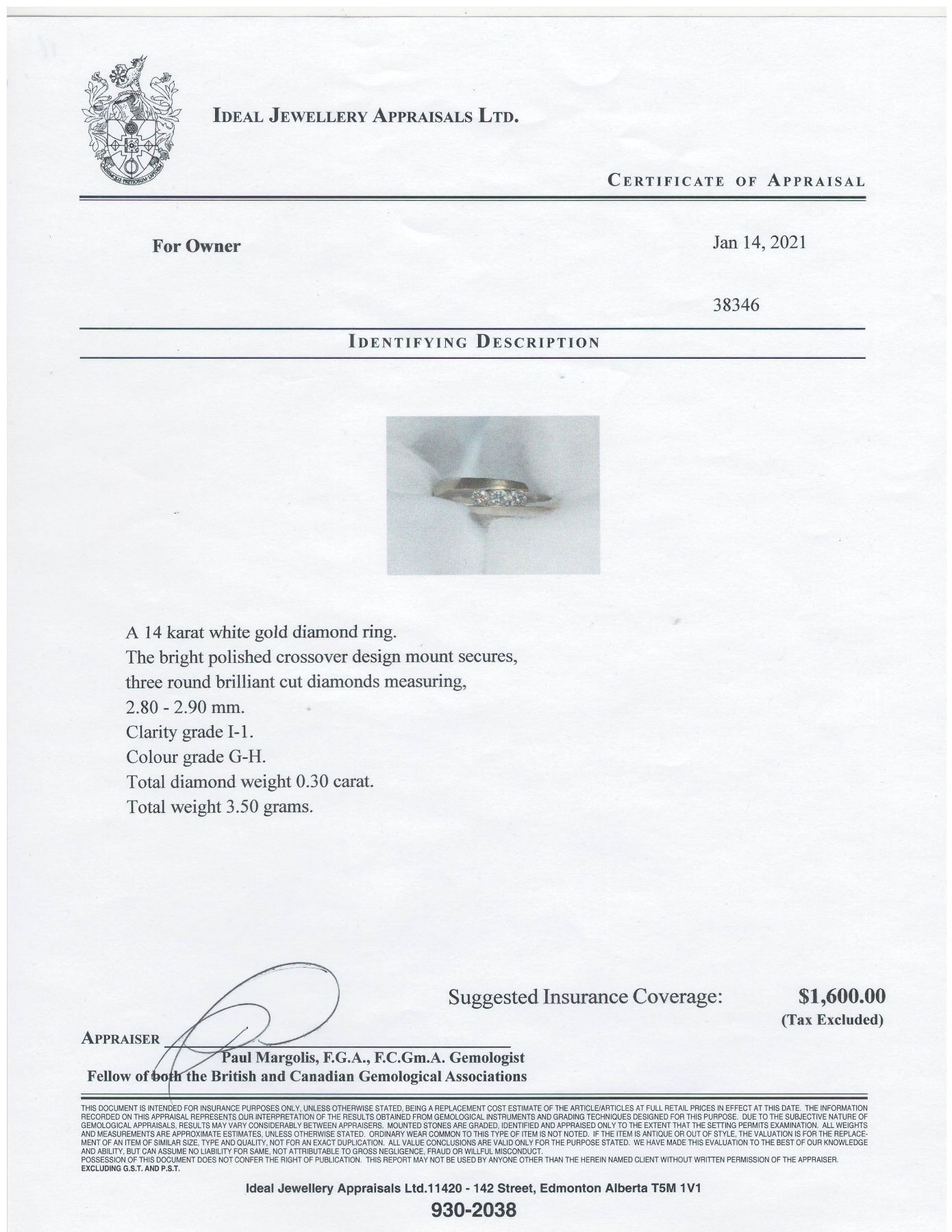 THE BRIGHT POLISHED CROSSOVER DESIGN MOUNT SECURES THREE ROUND BRILLIANT CUT DIAMONDS MEASURING 2.80 - 2.90 MM., CLARITY GRADE I-1., COLOUR GRADE G-H. TOTAL DIAMOND WEIGHT 0.30 CARAT. TOTAL WEIGHT 3.50 GRAMS. COMES WITH CERTIFICATE OF APPRAISAL FROM LOCAL APPRAISER, SUGGESTED INSURANCE COVERAGE $1600.00. JEWELLERY