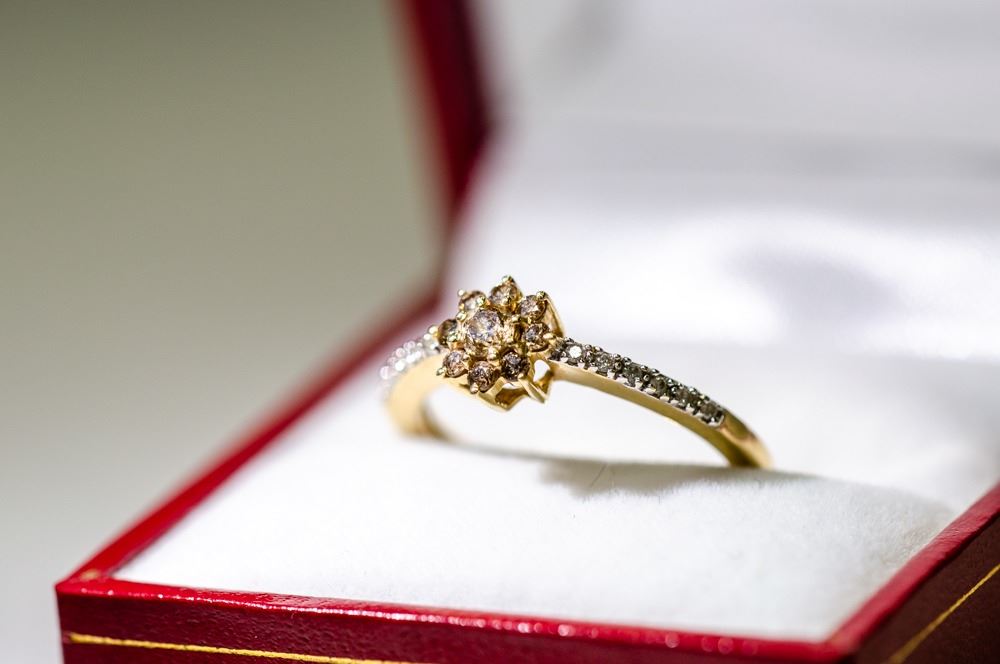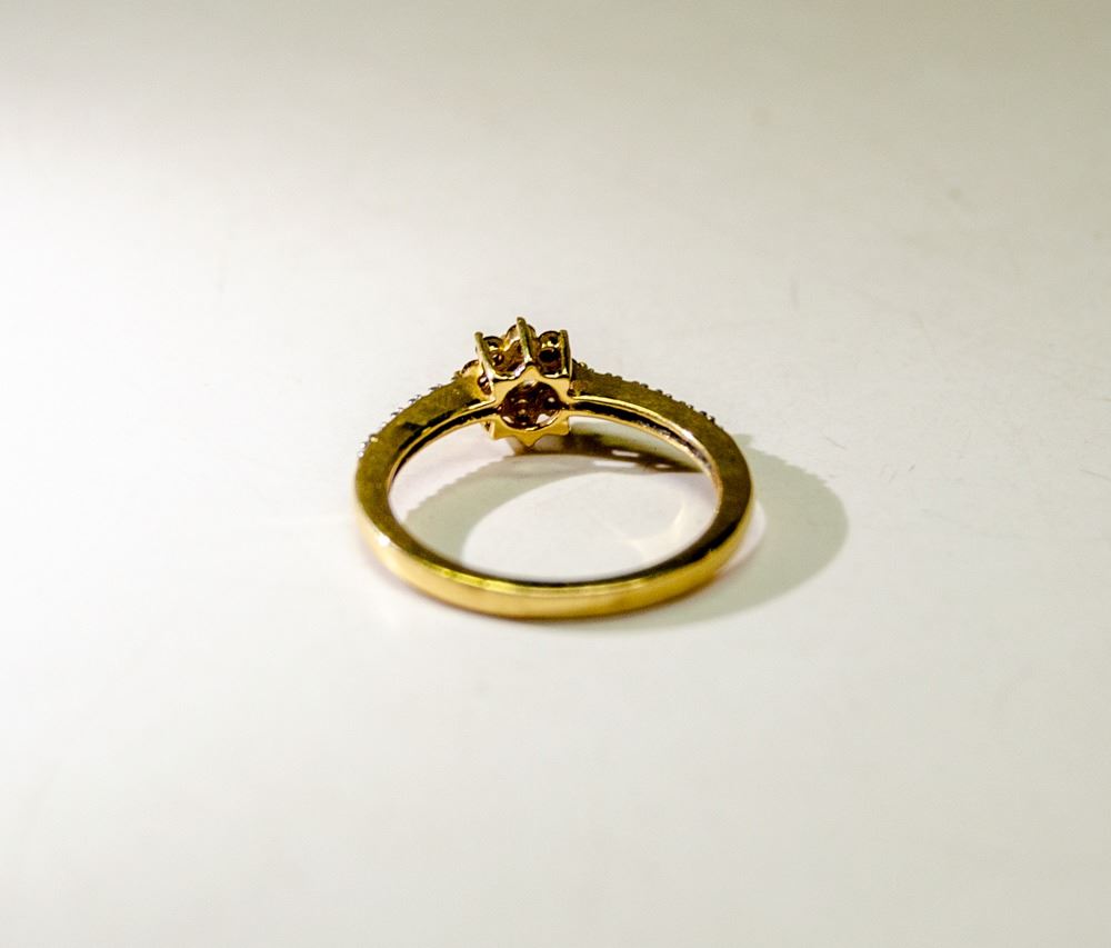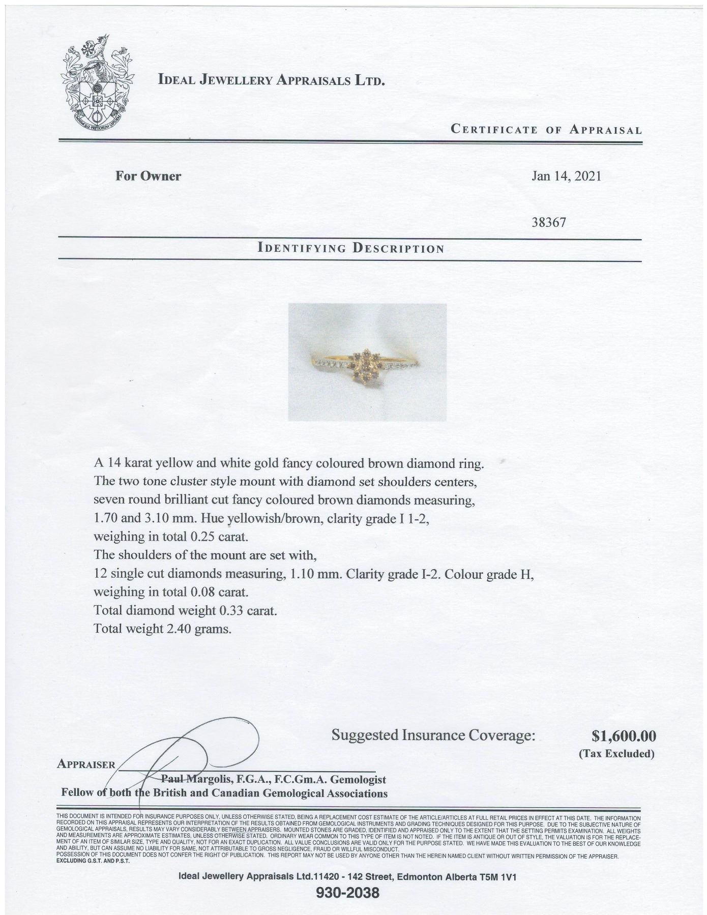 DIAMOND RING. SIZE 7.5. THE TWO TONE CLUSTER STYLE MOUNT WITH DIAMOND SET SHOULDERS CENTERS SEVEN ROUND BRILLIANT CUT FANCY COLORED BROWN DIAMONDS MEASURING 1.70 AND 3.10 MM., HUE YELLOWISH/BROWN, CLARITY GRADE I 1-2, WEIGHING IN TOTAL 0.25 CARAT. THE SHOULDERS OF THE MOUNT ARE SET WITH 12 SINGLE CUT DIAMONDS MEASURING 1.10 MM., CLARITY GRADE I-2. COLOR GRADE H, WEIGHING IN TOTAL 0.08 CARAT. TOTAL DIAMOND WEIGHT 0.33 CARAT. TOTAL WEIGHT 2.40 GRAMS. COMES WITH CERTIFICATE OF APPRAISAL FROM LOCAL APPRAISER, SUGGESTED INSURANCE COVERAGE $1600.00. JEWELLERY