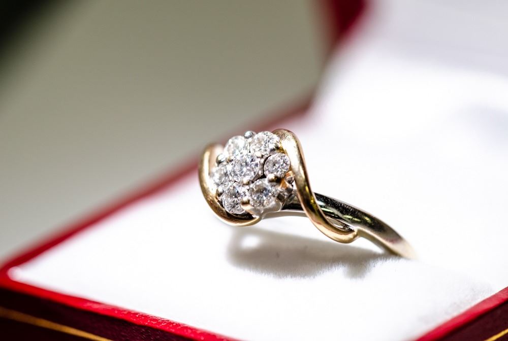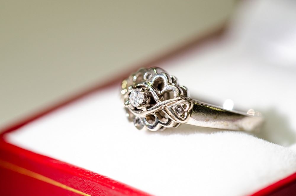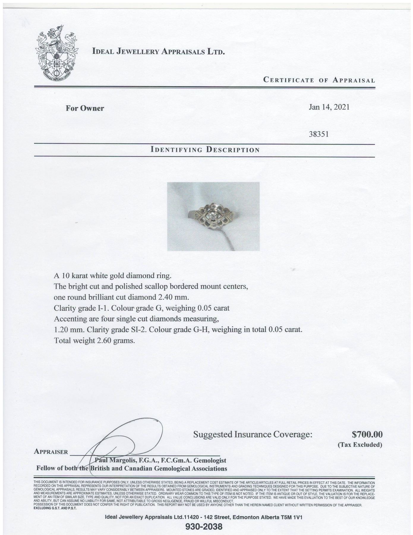 THE BRIGHT CUT AND POLISHED SCALLOP BORDERED MOUNT CENTERS ONE ROUND BRILLIANT CUT DIAMOND 2.40 MM., CLARITY GRADE I-1., COLOR GRADE G, WEIGHING 0.05 CARAT. ACCENTING ARE FOUR SINGLE CUT DIAMONDS MEASURING 1.20 MM., CLARITY GRADE SI-2. COLOR GRADE G-H, WEIGHING IN TOTAL 0.05 CARAT. TOTAL WEIGHT 2.60 GRAMS. COMES WITH CERTIFICATE OF APPRAISAL FROM LOCAL APPRAISER, SUGGESTED INSURANCE COVERAGE $700.00. JEWELLERY