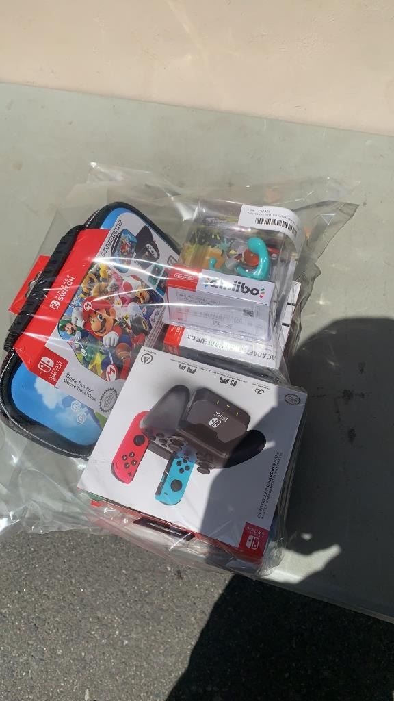 AS NEW NINTENDO SWITCH GAME TRAVEL CASE, AC ADAPTER, CONTROLLER CHARGING BASE AND AMIIBO CHARACTER