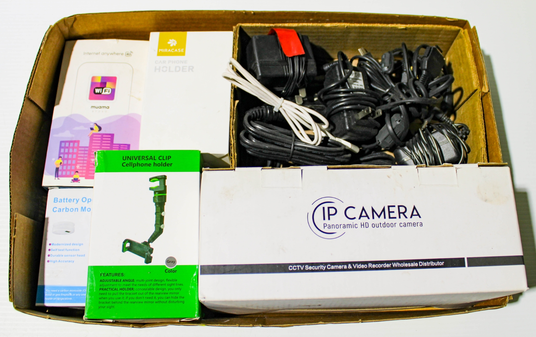INCLUDES ITEMS LIKE A CARBON MONOXIDE ALARM, USED OUTDOOR SECURITY CAMERA, CELL PHONE HOLDERS, ASSORT. POWER CORDS, ETC.