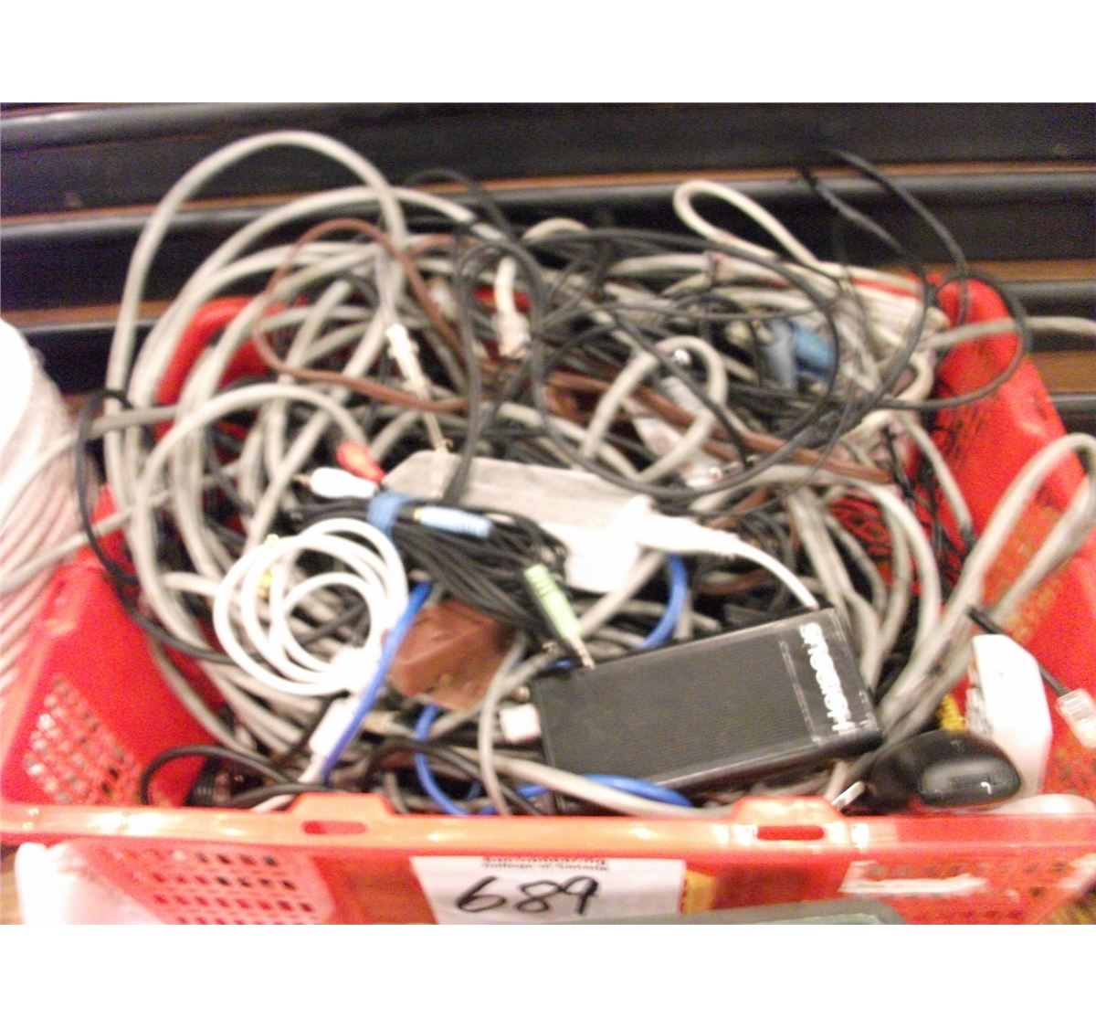 ASSORTED CABLES, COMPUTER ACCESSORIES, WIRE AND ADAPTORS - CONTENTS OF RED BASKET
