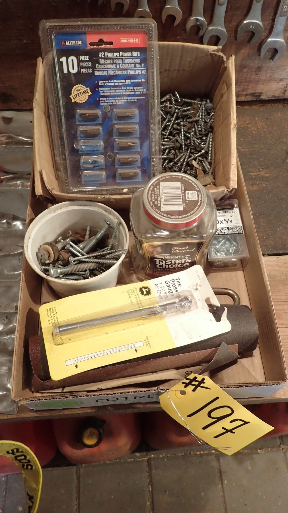 ASSORTED FASTENERS, LONGSHANK LOCK, TIRE PRESSURE GAUGE, SANDPAPER