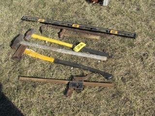 AXE; 2 SLEDGE HAMMERS; LEVELS; CROW BAR; JACK