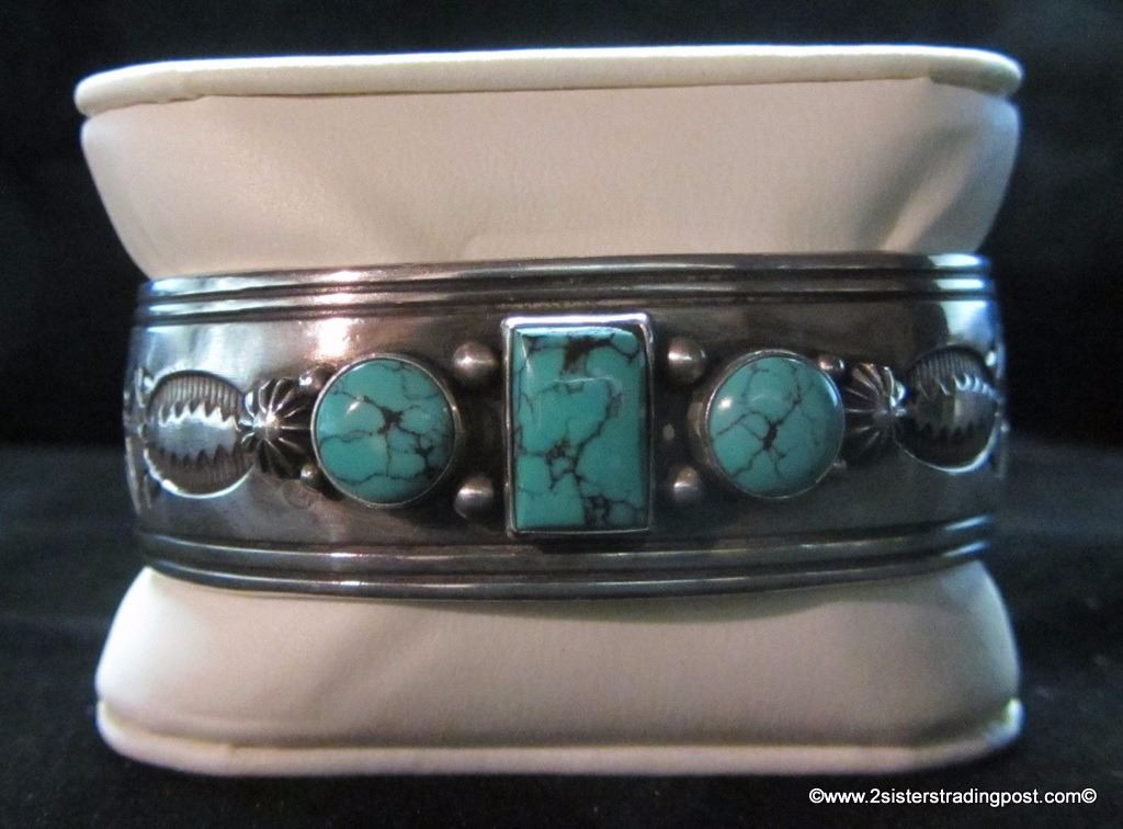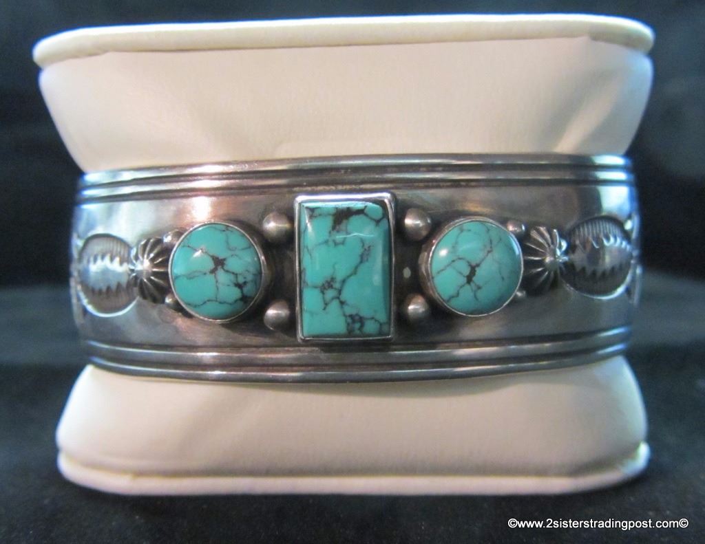 This is a .75" wide sterling silver cuff with 3 spider web turquoise stones. The piece is signed by the artist with a hand, inside the hand is A.T. © (A. Toadleana Hallmark) under the hand is the word Sterling. Cuff weighs 47 grams, inside cuff circumference 2.25" x 1.75" and cuff opening is 1.25". NOTE: Aaron Toadlena is known for hand construction of all silver from scratch with intuitive and beautiful placement of irregular stones.