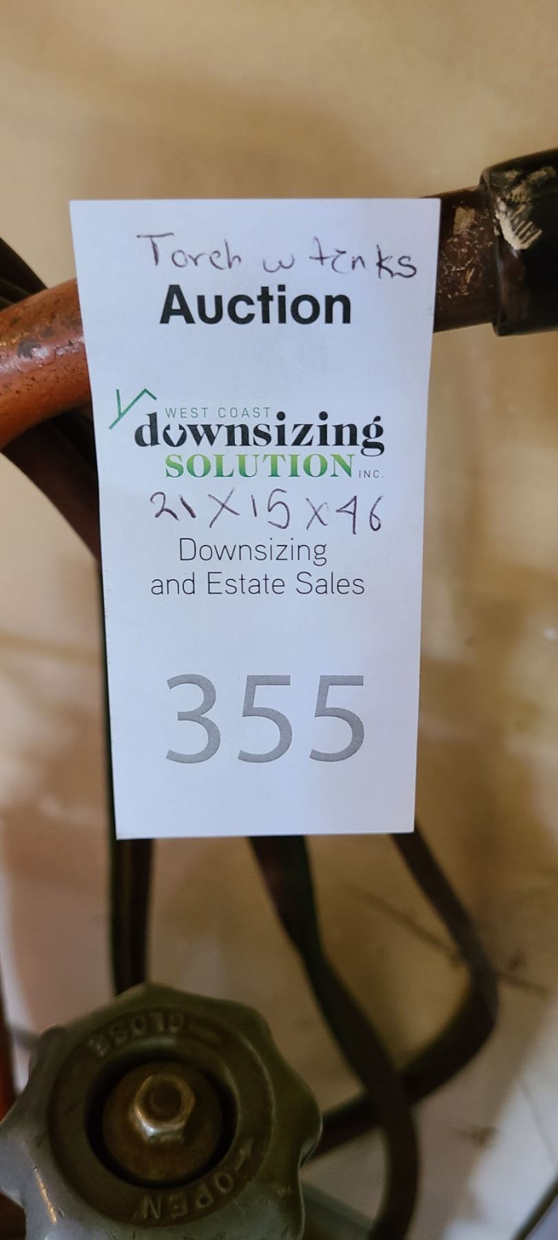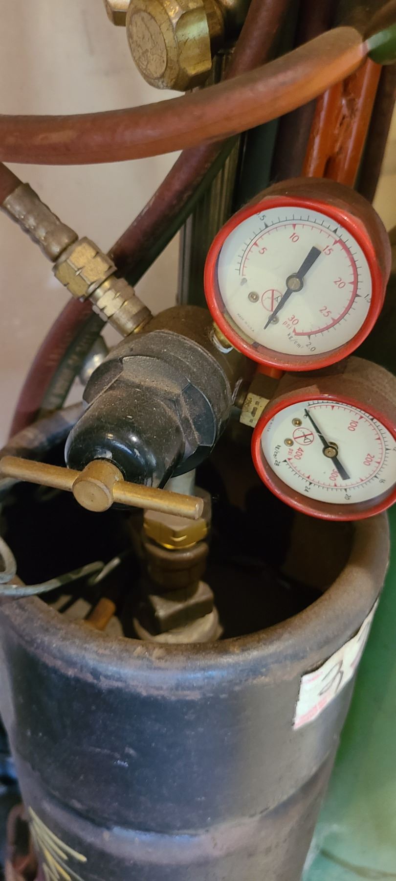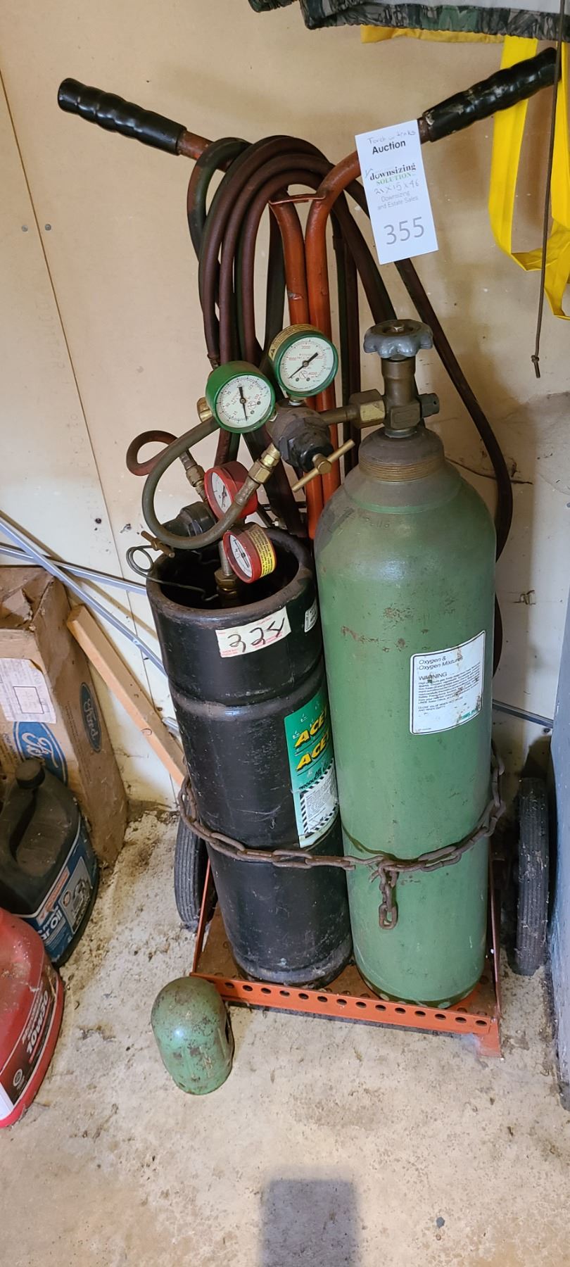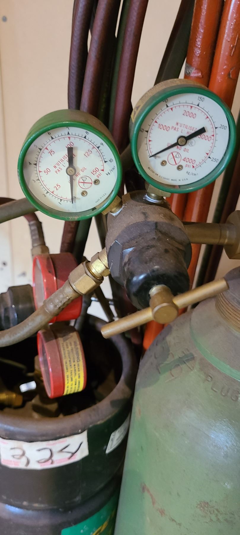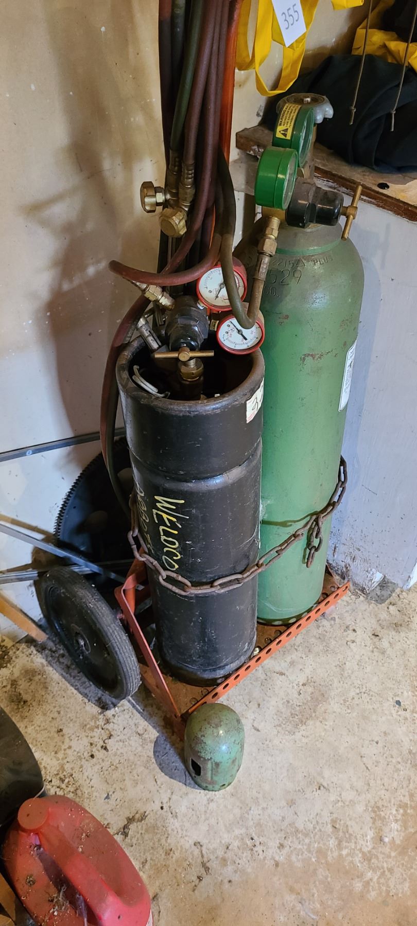 Acetylene tanks on rolling cart, tanks dated 1972 not checked for completeness but are heavy. pickup 3pm