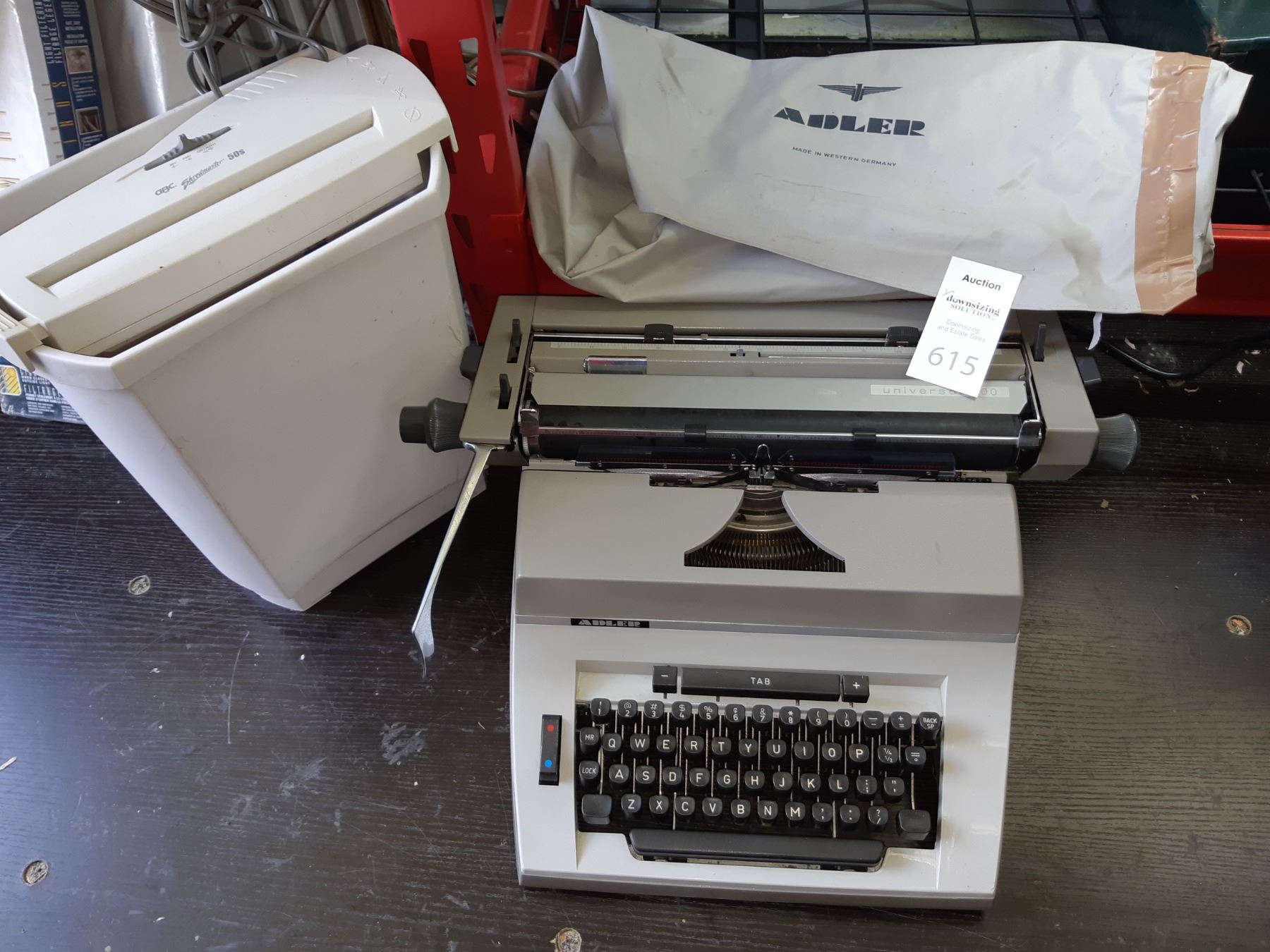 Adler typewritter made in Germany and Shredmaster shredder. Pickup at 9 am