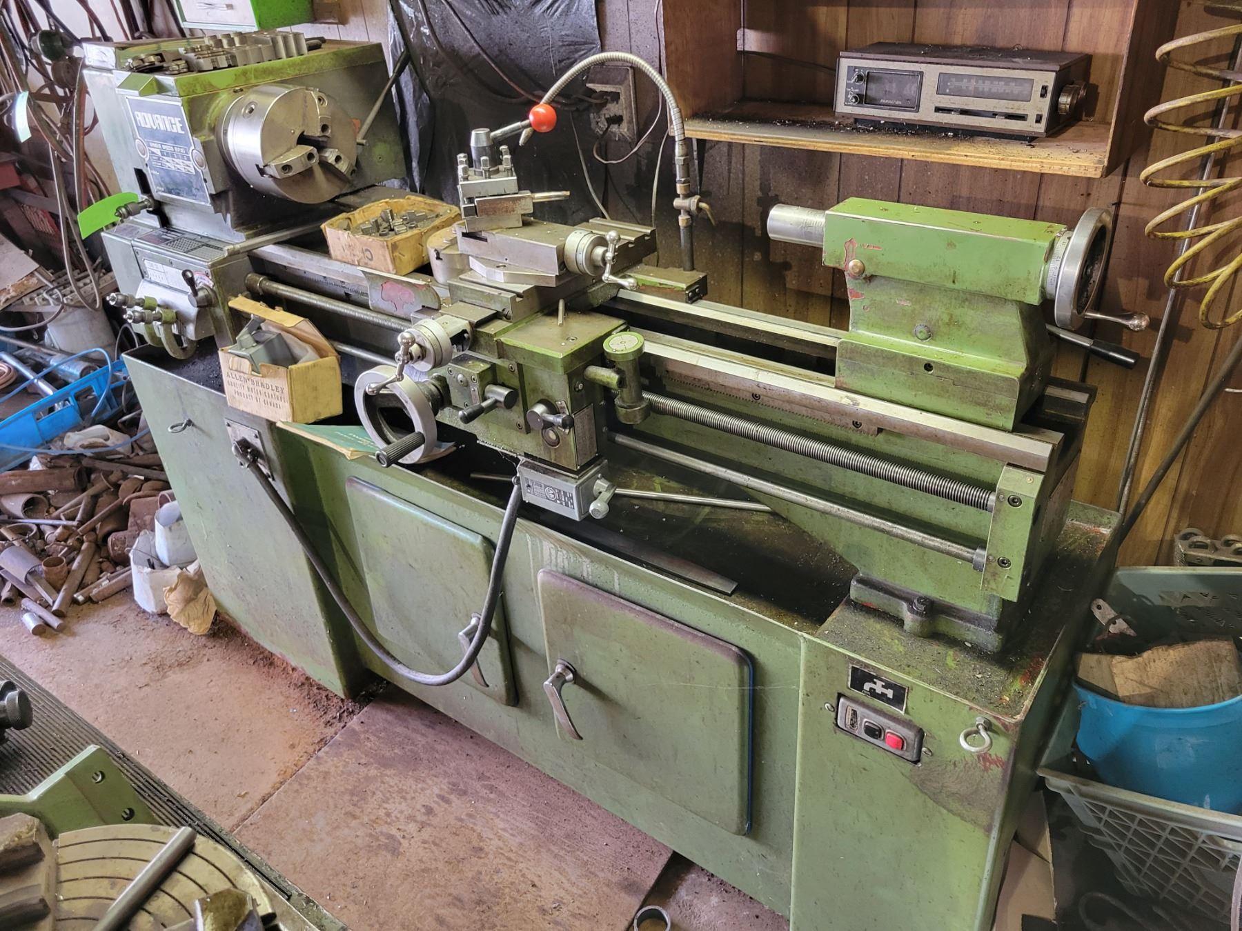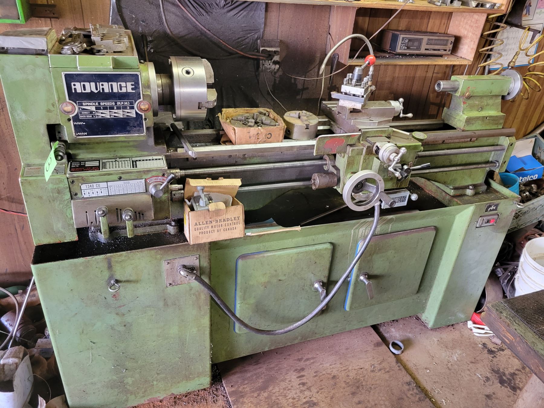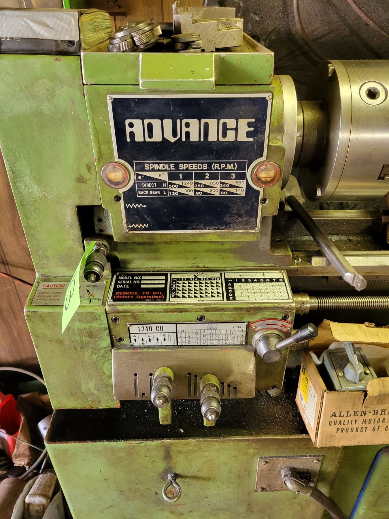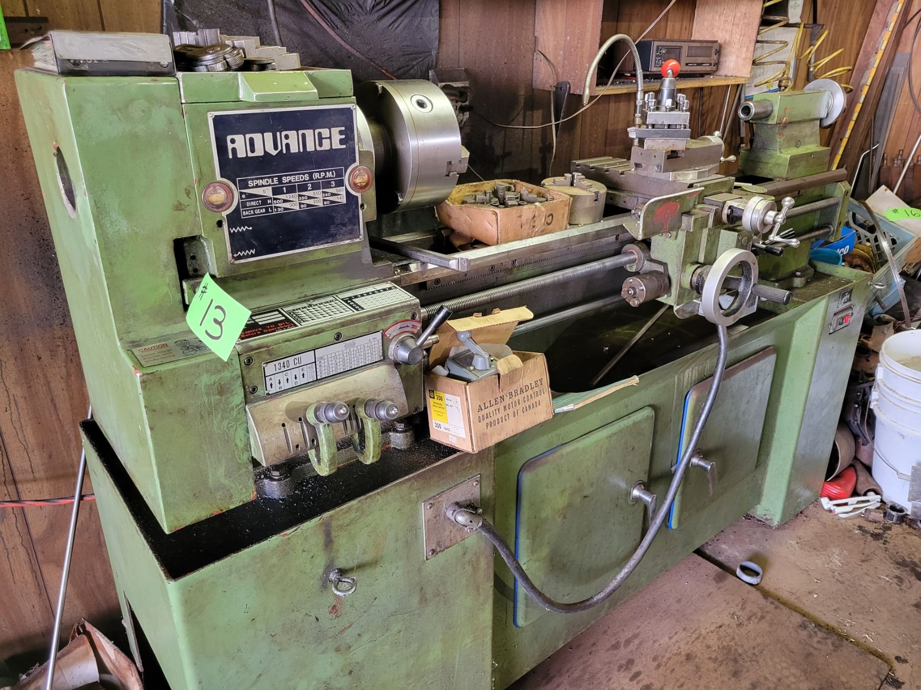 Advance 13"x40" Lathe, 1ph, Auto Feed, Coolant, 38mm/1.5" Bore, 220V, 3-Chucks and misc. (Not to be loaded until after 4pm July 19th due to the tight garage)
