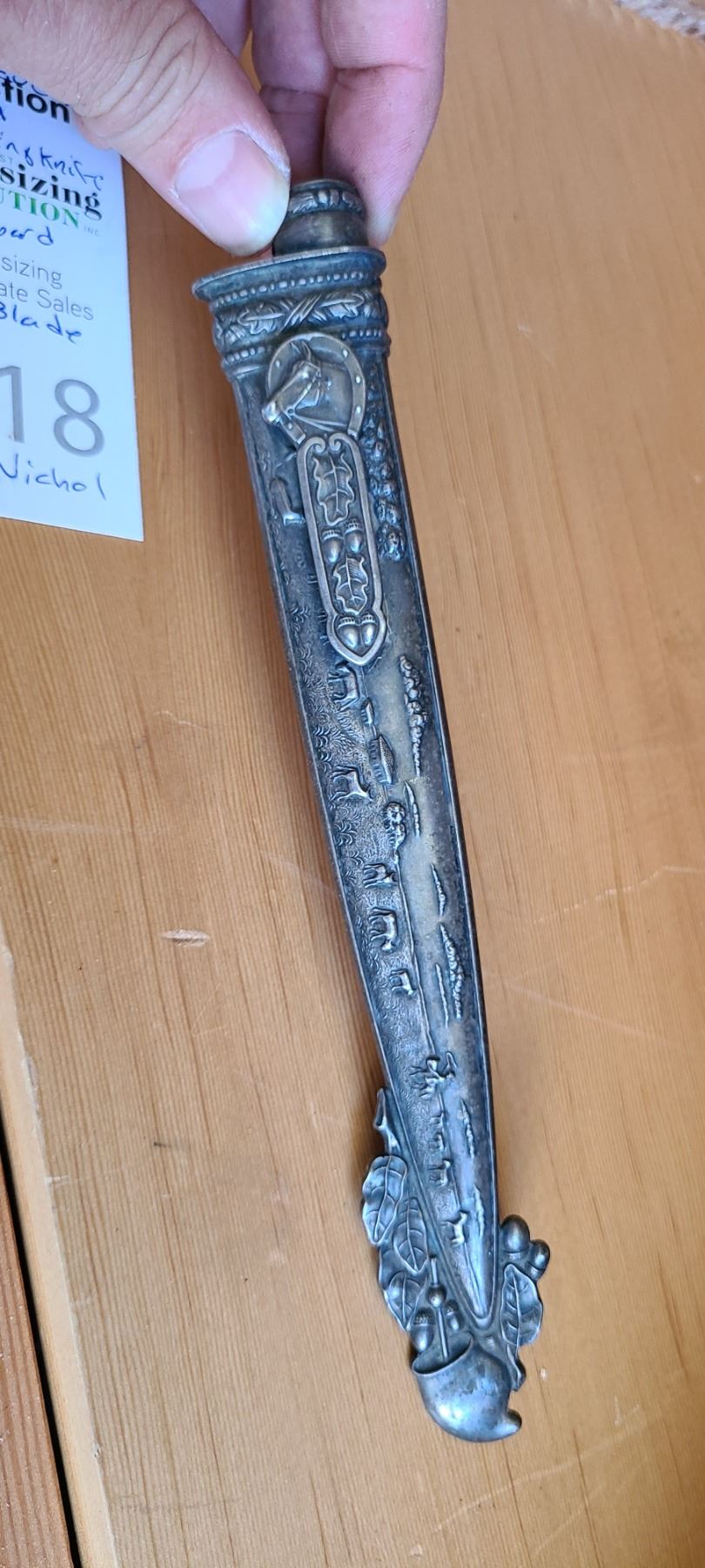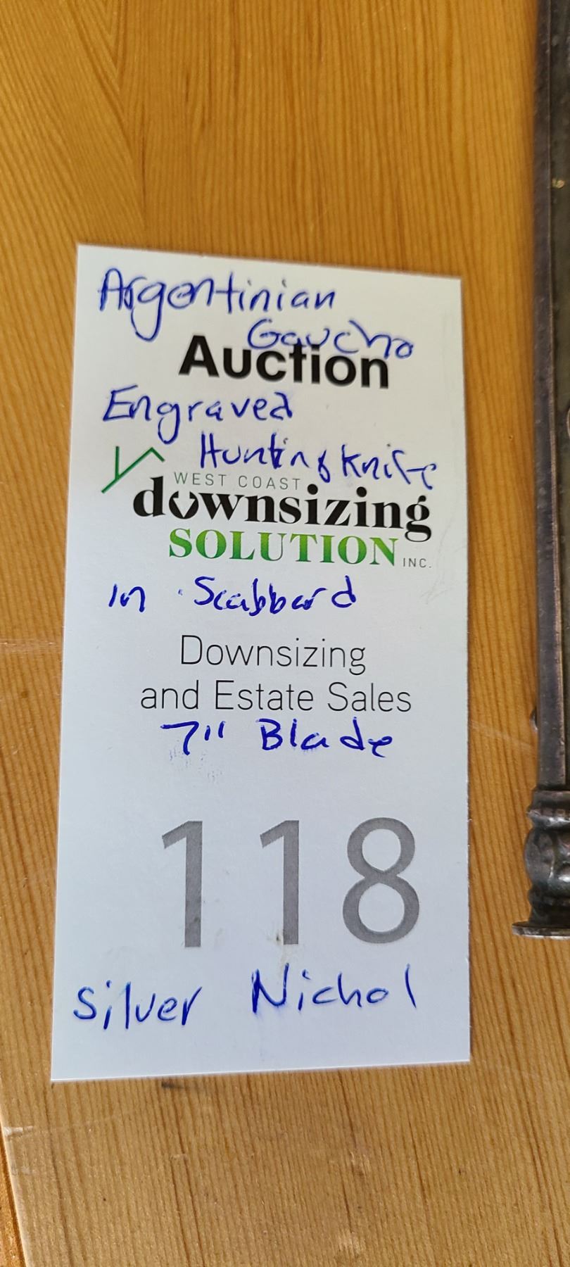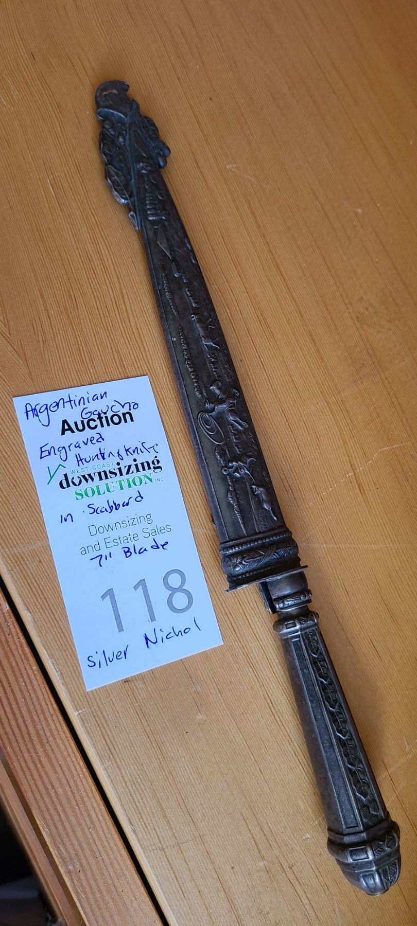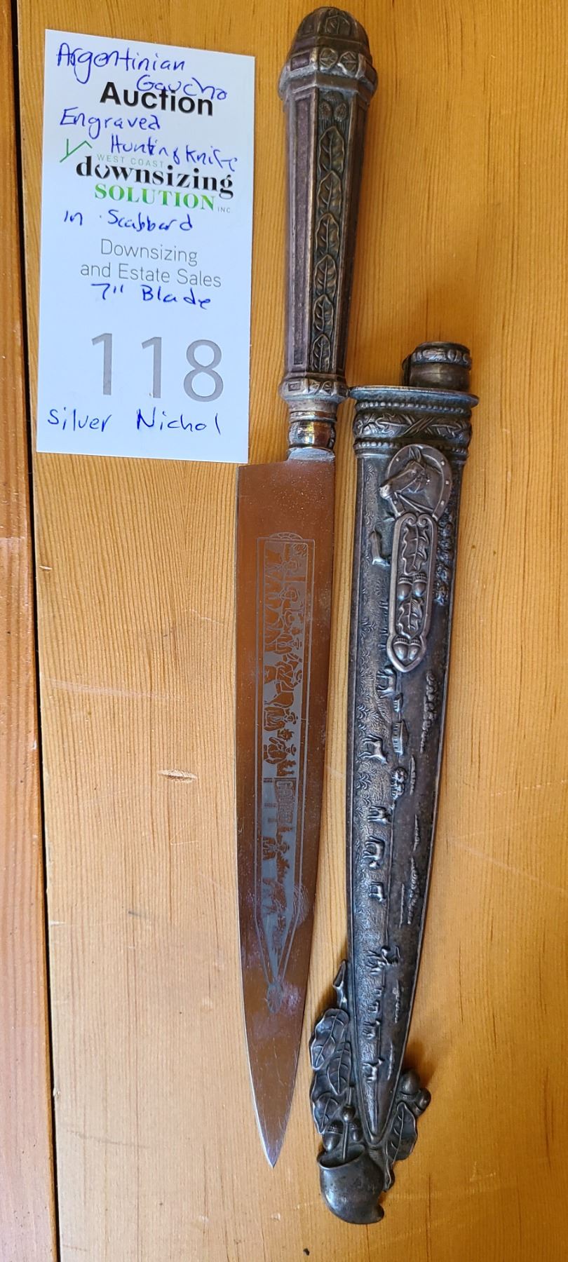 Silver & Nichol knife with 7" blade, engraved handle and scabboard. Pickup at 9 am