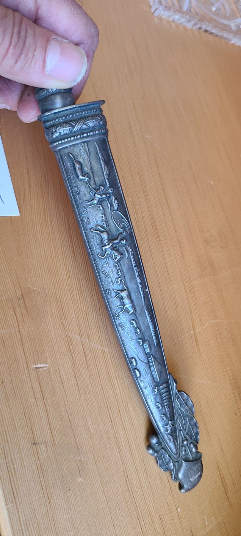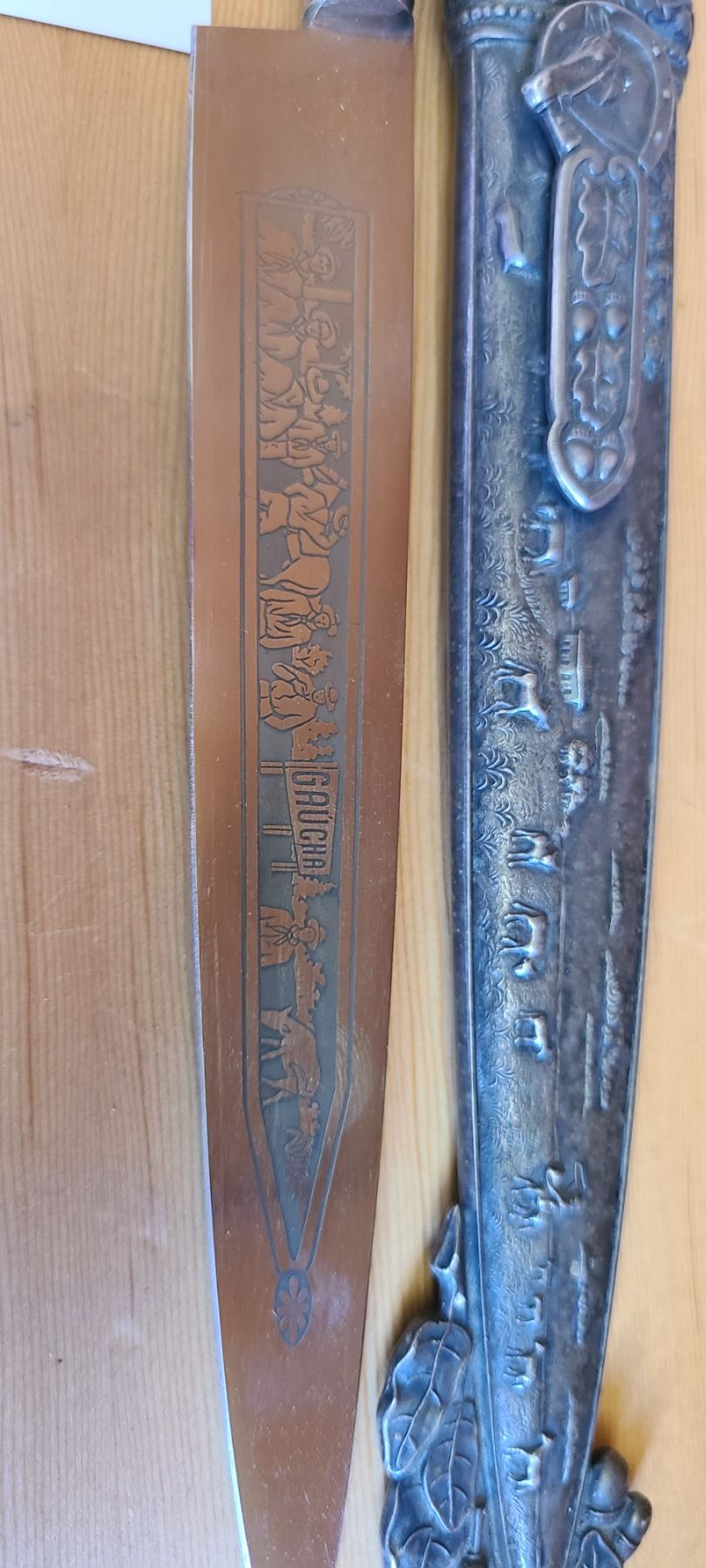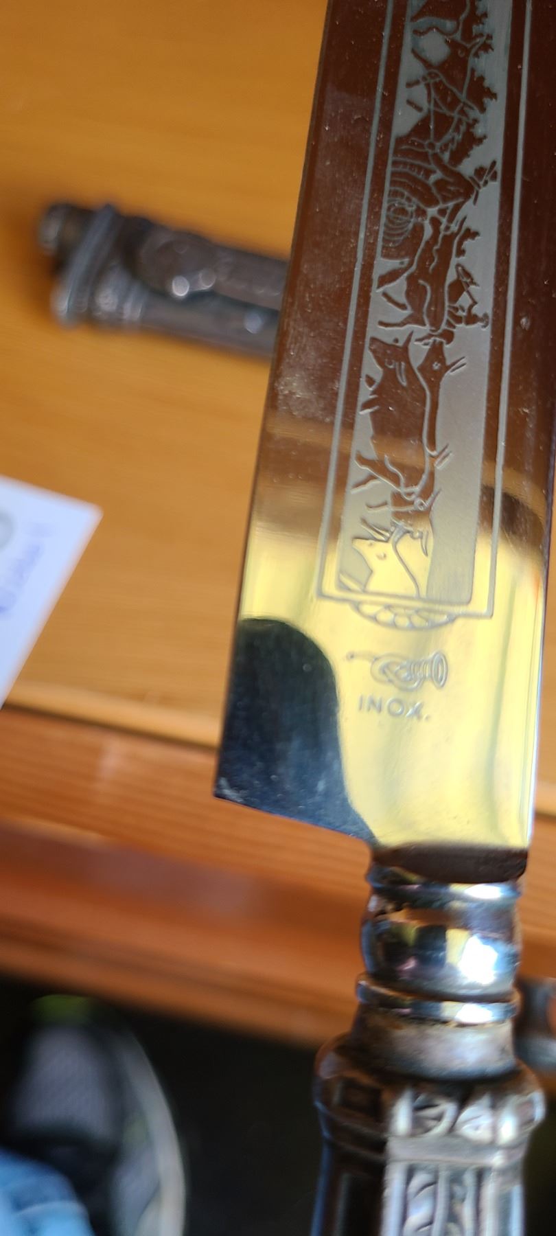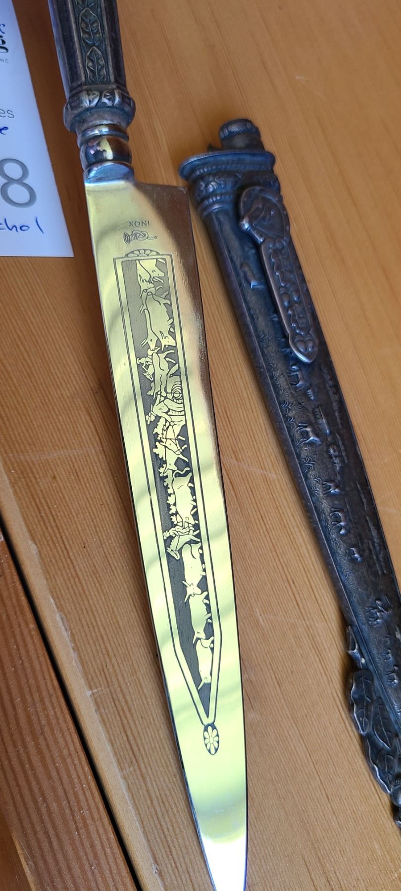 Silver & Nichol knife with 7" blade, engraved handle and scabboard. Pickup at 9 am