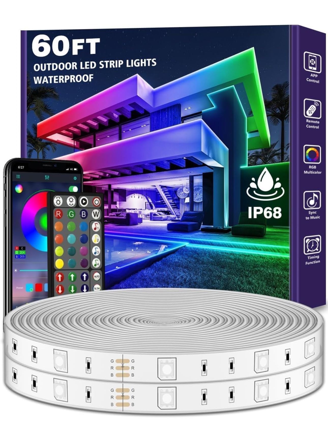 - AILBTON 60FT Outdoor LED Strip Light Waterproof,IP68 Outside LED Light Strip Kit Waterproof with App Remote Control,Music Sync RGB Exterior LED Rope Light for Balcony,Deck,Rooftop,Garden,Pool etc.