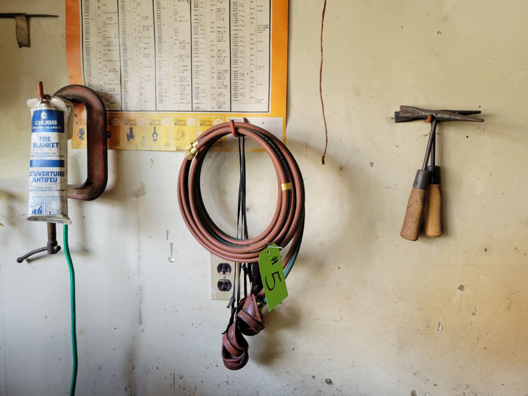 Air hose, welding goggles, 2- chipping hammers, fire blanket and misc.