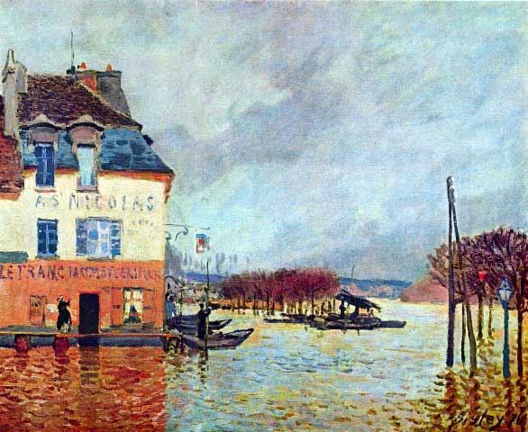 Artist: Alfred Sisley - Title: Flood at Port Manly - Medium: Fine Art Reproduction Giclee on Canvas - Image Size: Approximately 16.25 inches x 20 inches - Unframed on Unstretched Canvas - Biography: Alfred Sisley was an Impressionist landscape painter who was born and spent most of his life in France, but retained British citizenship. He was the most consistent of the Impressionists in his dedication to painting landscape en plein air.