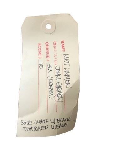 All the Pretty Horses (2000) - John's (Matt Damon) screen worn, black tetched, weave custom designed tunic dress shirt which buttons halfway down. Includes costume department, wardrobe tag. Worn as a pajama top. Can only see his back when he wears this in the film.
