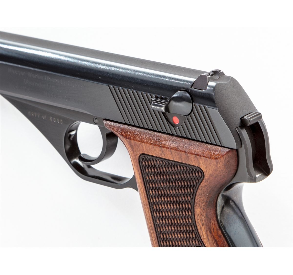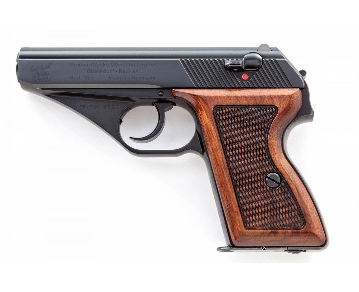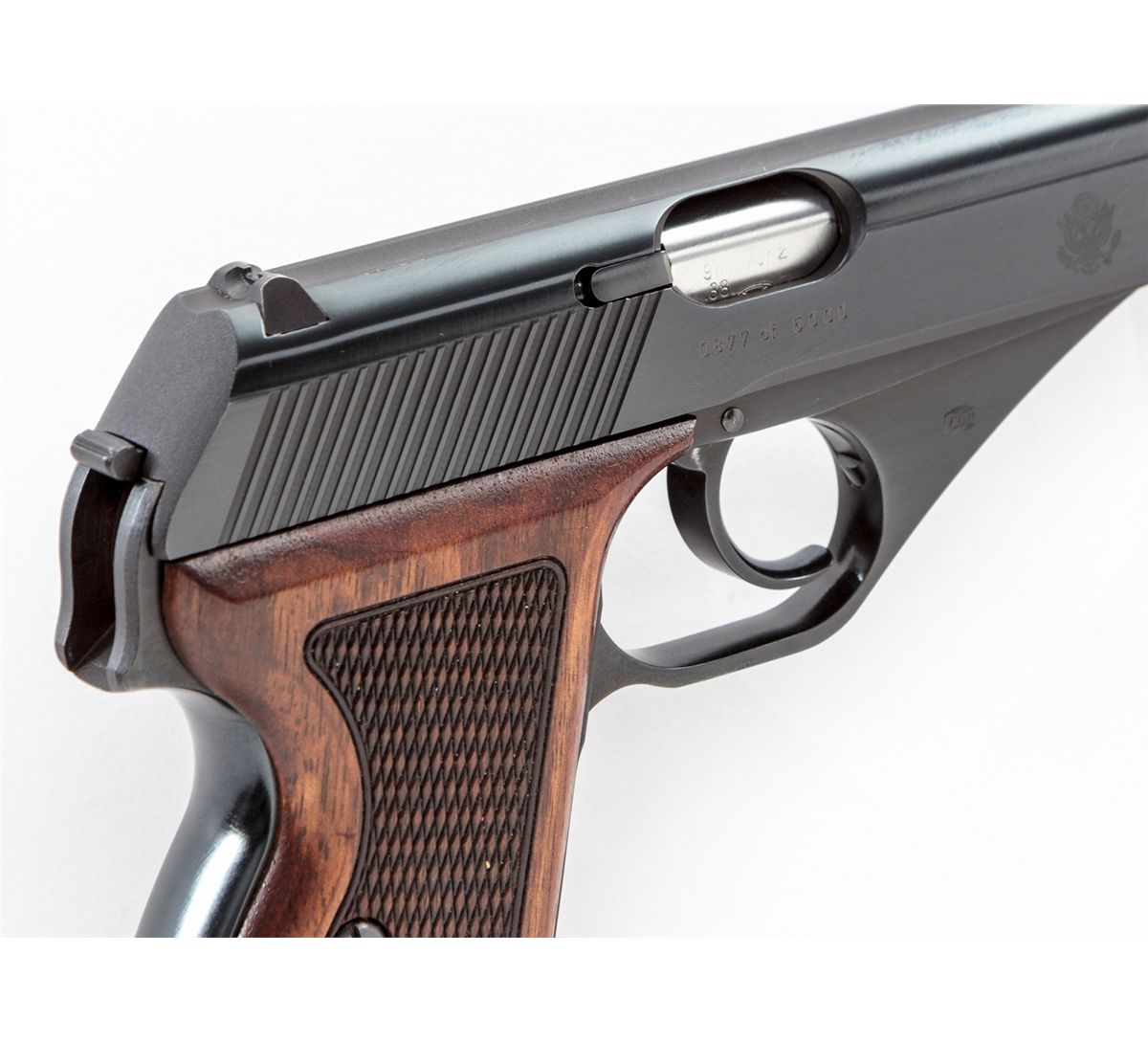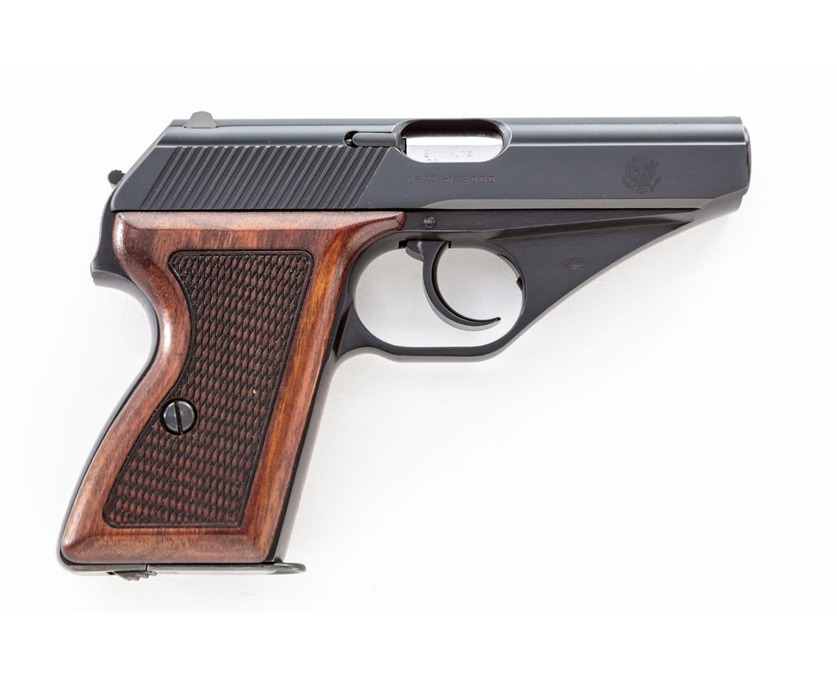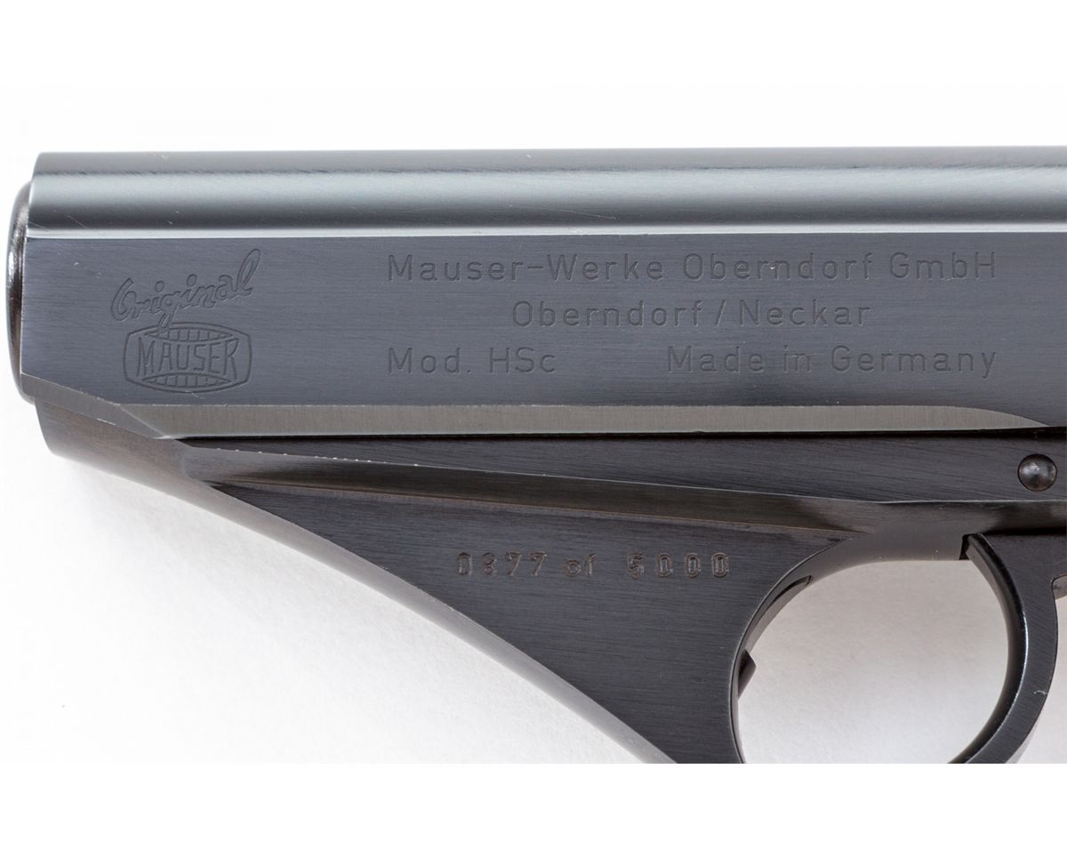 American Eagle Limited Edition Mauser HSc Semi-Automatic Pistol, #0877 (of 5000), .380 cal., 3-1/4'' barrel, blue finish, checkered walnut grips, with two magazines, in original box with associated paperwork and test target. Right side of slide with American eagle. Condition is excellent, appearing unfired, as new in original box. Est.: $500-$750. (Modern)