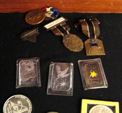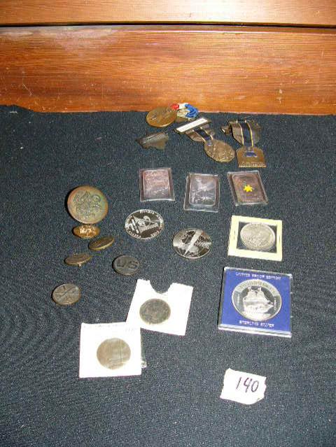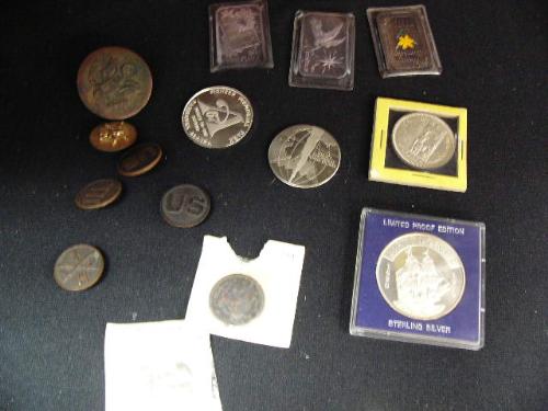 American Legion Department of Alaska 1937 badge; American Legion Department of Alaska 1934 badge; Denver badge; early Knights of Columbus badge; 3 one ounce silver commemorative bars; 1958 Canadian Silver Totem dollar; 2 Alaska Silver tokens; group of U.S. Military buttons; 1820 U.S. large cent; 1845 U.S. large cent; sterling silver proof edition 1970 Mayflower silver 1-ounce coin (37)