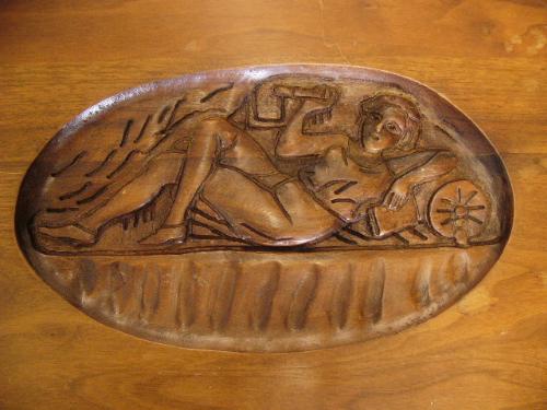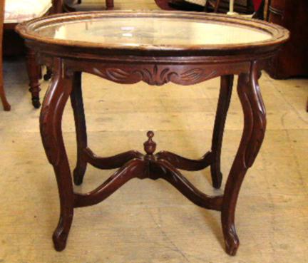 American walnut glass top coffee table with carved lady reading, circa 1940 (227)