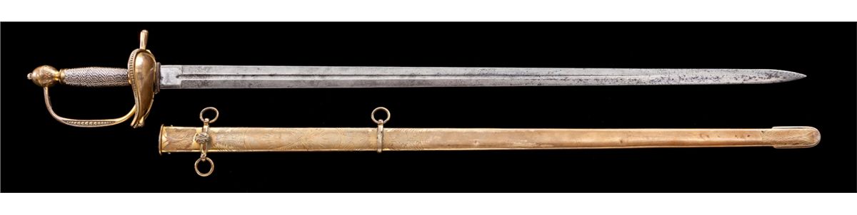 U.S. Pattern 1832 General & Staff Officer's Sword, in scabbard, by Ames, 31'' blade, 38'' overall, based on an English pattern. This sword remained a standard weapon for these officers until 1850 when regulations were changed and staff officers were required to wear the staff & field officer's saber. Technically it remained the regulation for the General Officers until 1872 and was the main sword worn by flag rank officers throughout the Civil War. Straight blade, double edged, with even taper to point; central fuller which terminates within 1'' of tip. Etched with floral sprays and a Federal eagle with a motto-bearing ribbon; additionally etched ''N.P. Ames, Cutler, Springfield'' to ricasso. Grips are found either with shell of silver over wood and incised to resemble wire wrapping, or as this example, wrapped with wire. Globular two-piece pommel with rounded knucklebow, which is flattened in the center and decorated in a beaded design. Straight quillions are decorated with eight-point star at each end. All metal parts of the hilt, except grip, are gilded brass. This scabbard is predominantly gilt brass as well, with small applied scroll bearing Ames inscription. Condition is fine with thinning to etched portions of blade. Wire wrap at grip may be non-factory. Scabbard shows minor dings and thinning to gold plate. Leather washer is intact. Est.: $1,800-$2,400.