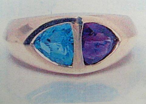 Amethyst and Blue Topaz Lady's Ring 14 K yellow gold- amethyst is trillion, faceted approx. 1.00 carats, transparent and purple; blue topaz is trillion, faceted approx. 1.00 carats, transparent and sky blue- estimated retail replacement cost $720 (12)