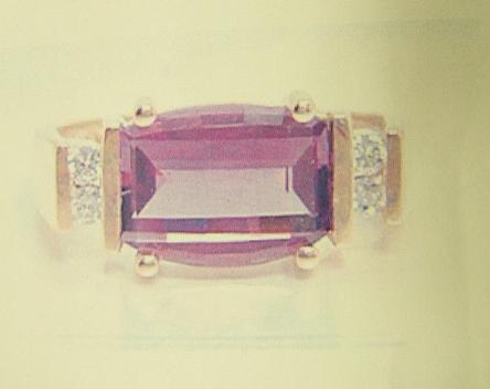 Amethyst and diamond lady's ring 10K yellow gold, Amethyst cushion shaped, faceted, approx. 3 carats, transparent medium purple, diamonds round brilliant cut, approx. .12 carats, SI2, H, Estimated replacement cost $1275.00 (12)