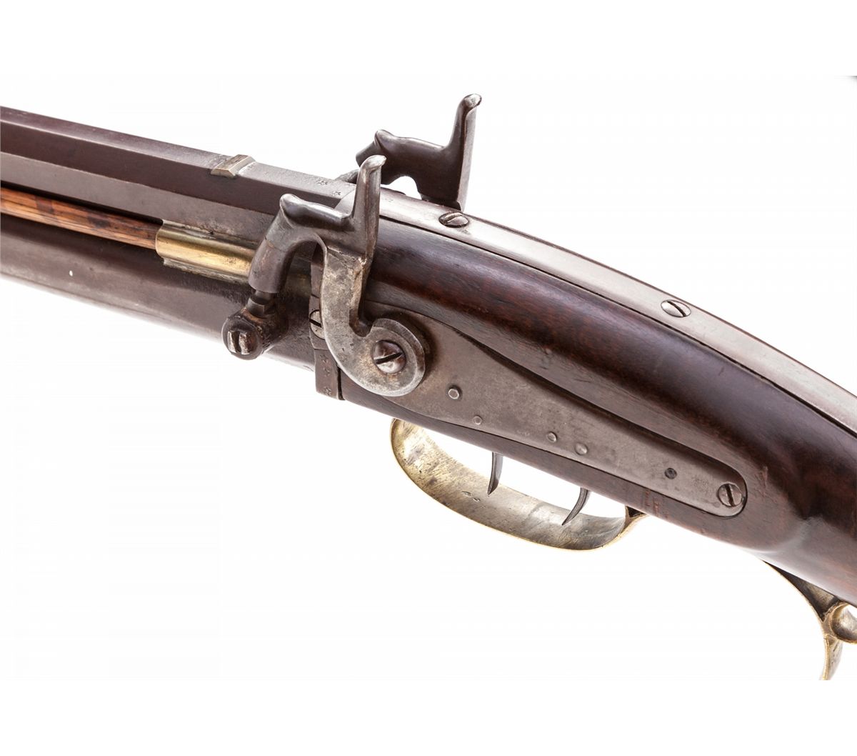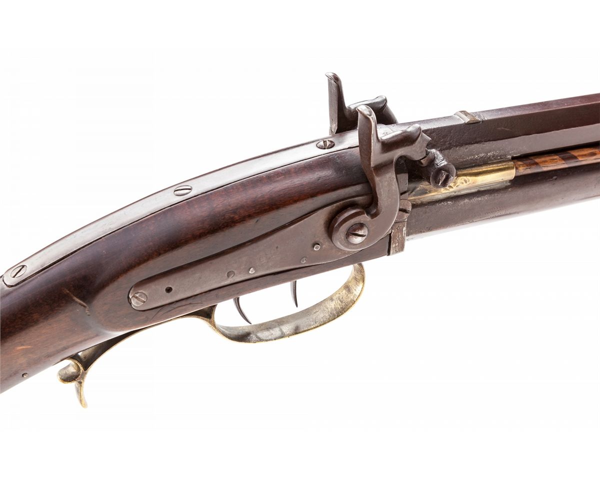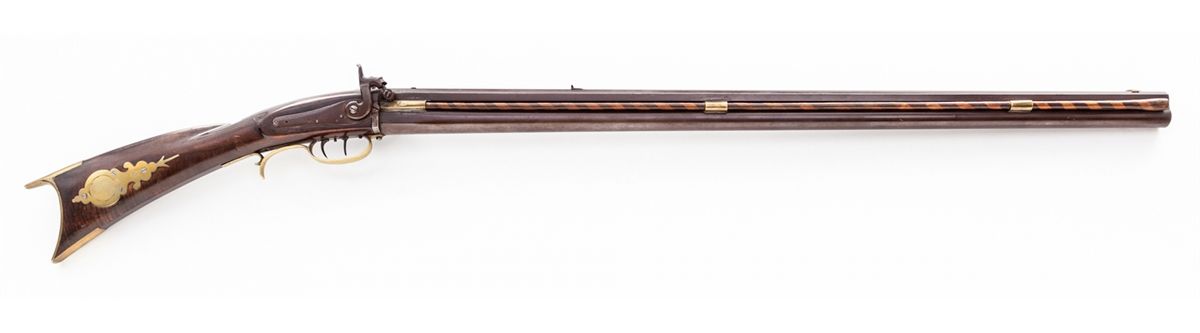 Amos Benfer Over/Under Combination Percussion Gun, .45/12 ga., 35'' barrels, brown finish, dark stained hardwood stock, double set trigger, brass buttplate, patchbox and ramrod rings. Marked ''Amos Benfer'' with multiple star motifs to top barrel flat. Ca. 1860s, from Beardstown, PA. Condition is about fine with moderate general patina, and minor restoration work to stock. Shotgun hammer will not stay in the cocked position. Est.: $1,000-$1,500. (Antique)