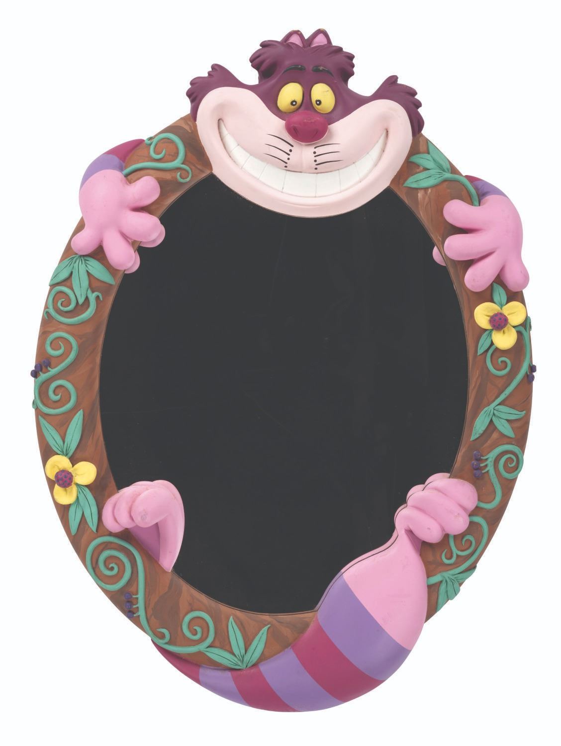 (Disney, 1990s) A rare mirror featuring the Cheshire Cat from Walt Disney's"Alice in Wonderland" featuring floral designs around the frame. Measuring 21" x 27.5", the mirror is in good condition with scuffs, scratches, stains, and wear.