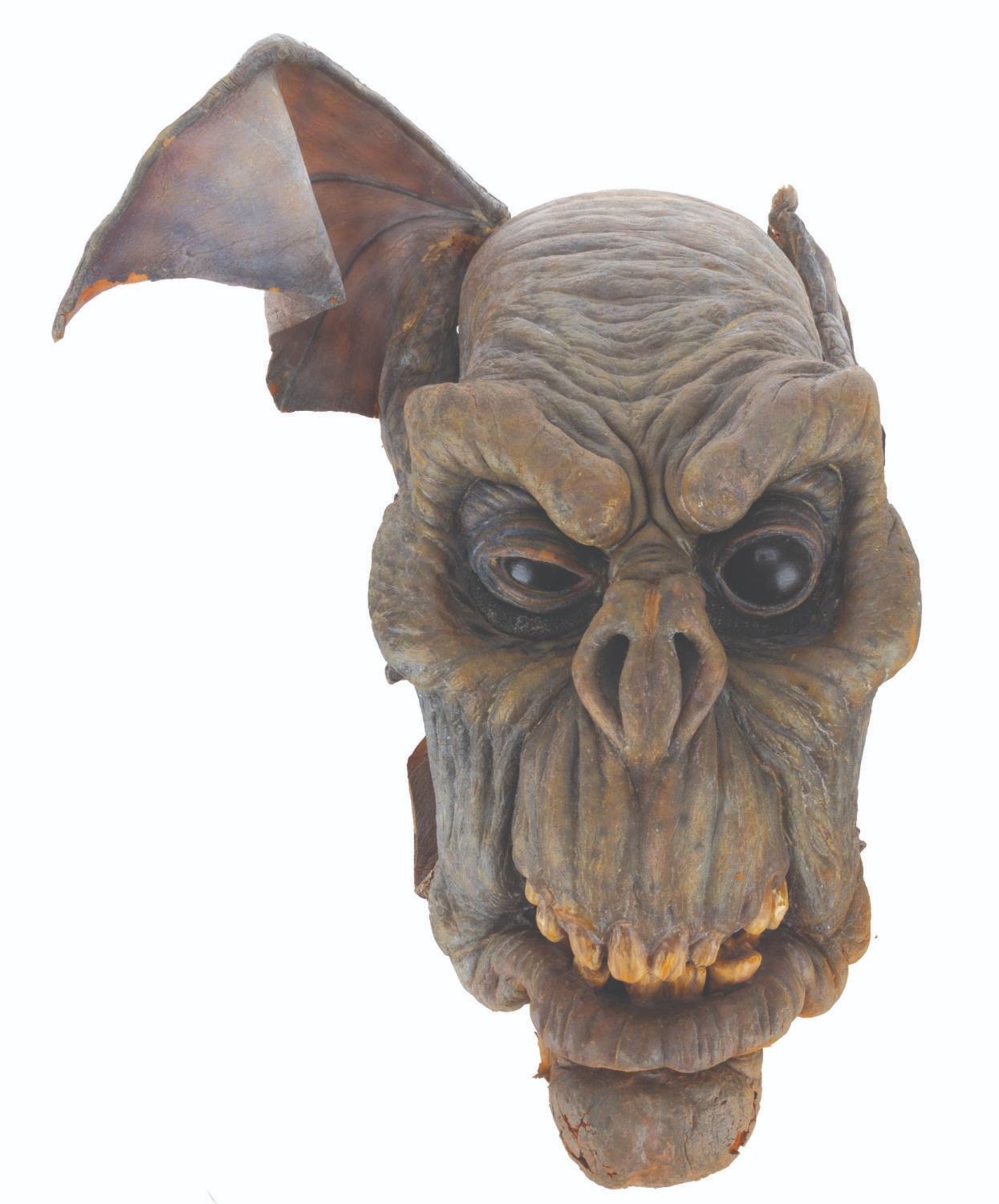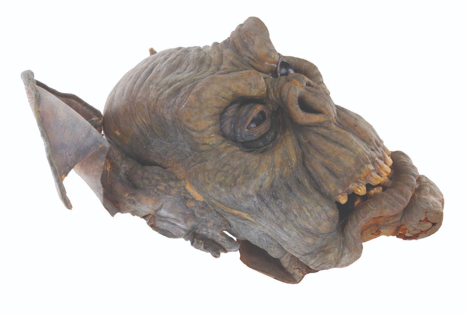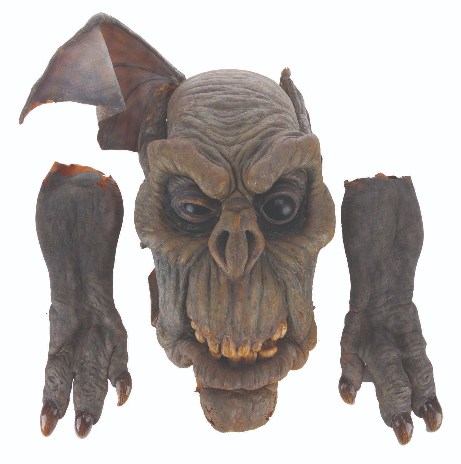 (CBS, 1992) A screen-used ghoul mask and hands from the Howie Mandel-starring television series"The Amazing Live Sea Monkeys." The hand-painted foam mask and hands were worn in the episode "Haunted Lighthouse," where the Sea Monkeys face off against villains wearing ghoul masks. The mask measures 10" x 14" x 20", and each hand measures 3" x 5" x 15". The items are in fair condition, with moderate foam loss, heavy deterioration, paint loss, soiling, and discoloration.