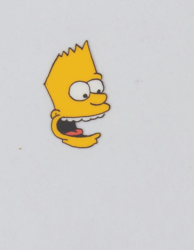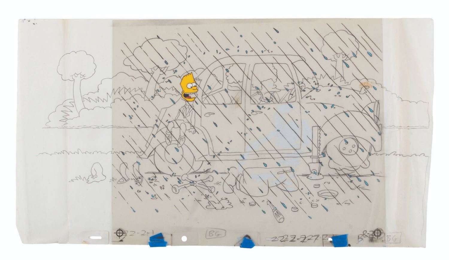 (20th Century Fox, 1988) An original production cel and layout drawing from"The Simpsons" animated short,"The Pagans." Created for "The Tracey Ullman Show," "The Simpsons" debuted in short animated segments before becoming a standalone sitcom. Bart's head measures 1" x 1.5" on a 10.5" x 12.5" cel, while the layout drawing measures 10.25" x 19". The hand-painted cel is in very good condition with light scuffing and tape at the bottom to register the cel to the drawing. The layout is in fair condition with heavy creasing, staining, and discoloration from production use and age.