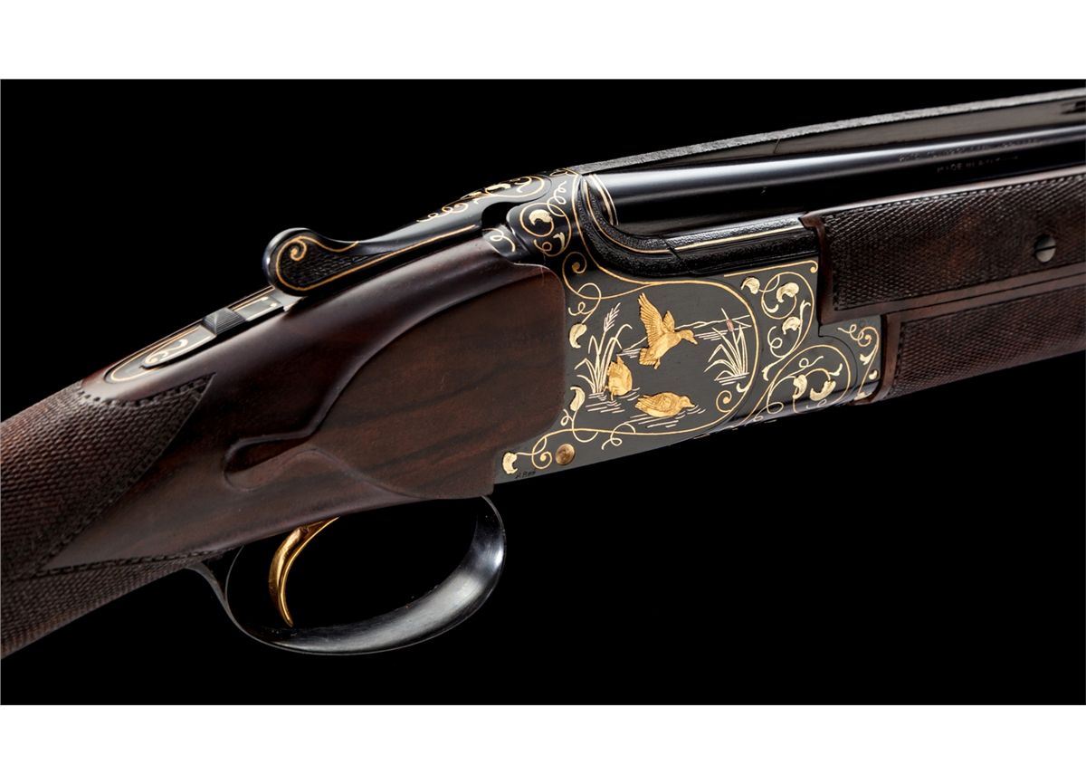 One-of-a-Kind Angelo Bee Exhibition Grade Engraved and Three-Color Gold Inlaid Belgian Browning Model 25 Over/Under Shotgun, #24459, 20 ga., 28'' vent rib barrel choked Mod./IC, exhibition walnut stock with false three-piece forend. Left scene depicts fighting pheasants; right scene with pintail ducks in various positions, with classic three-color gold Belgian scrolls and inlaid flora. Bottom of frame, triggerguard tang, and forend latch are profusely inlaid with three-color gold Belgian scrolls and pheasants. Fancy oil-finished claro walnut stock with wraparound checkering having beaded borders. Butt with skipline checkering and gold-inlaid screws. Condition is excellent as enhanced with exquisite game scenes. Stock with small pressure ding to top of comb. Impossible to duplicate for under $30,000. Est.: $18,000-$24,000. (Modern)