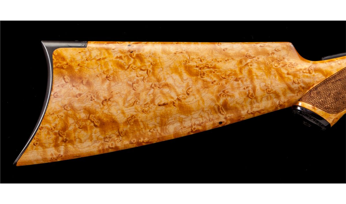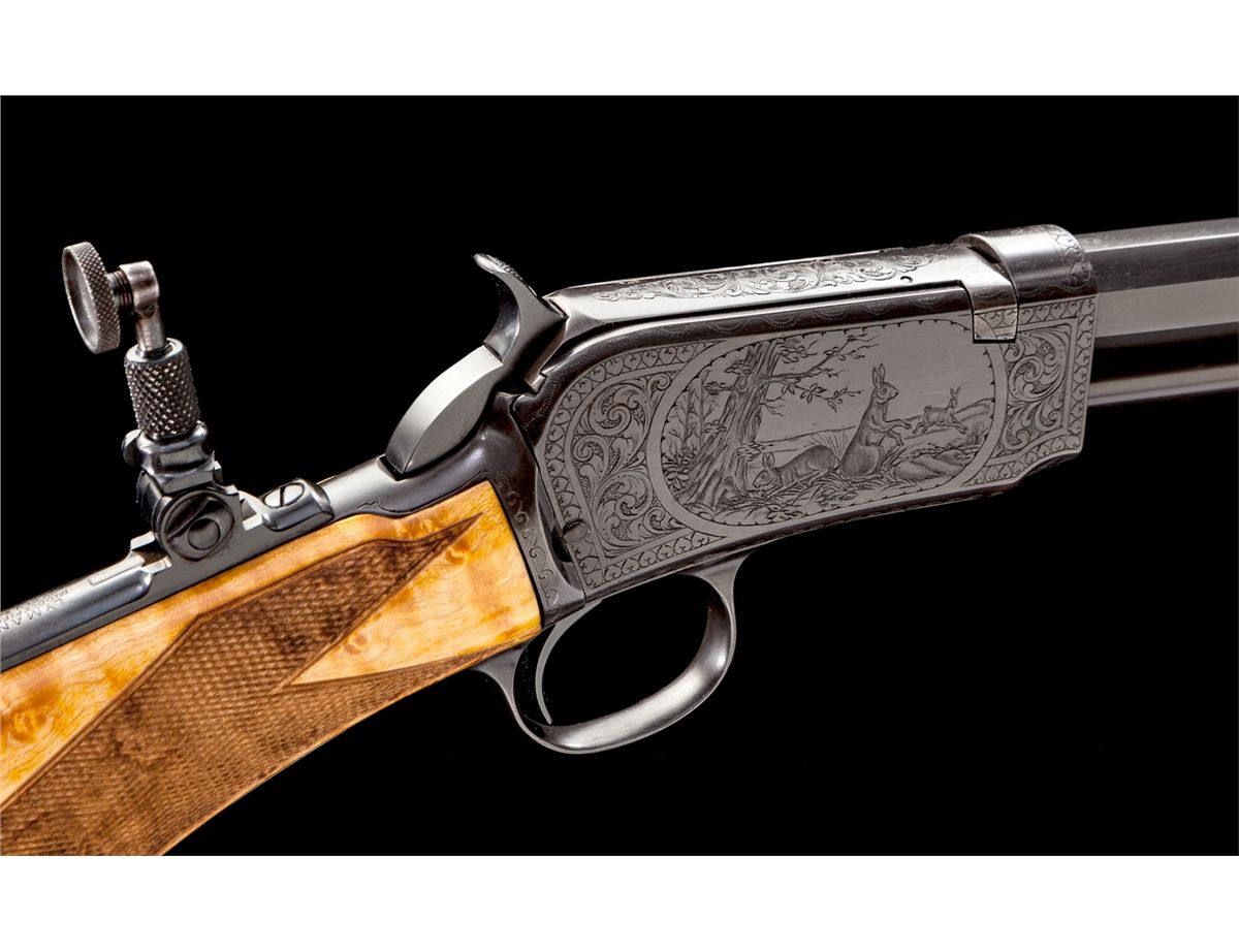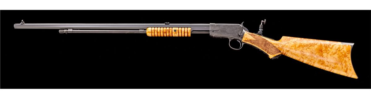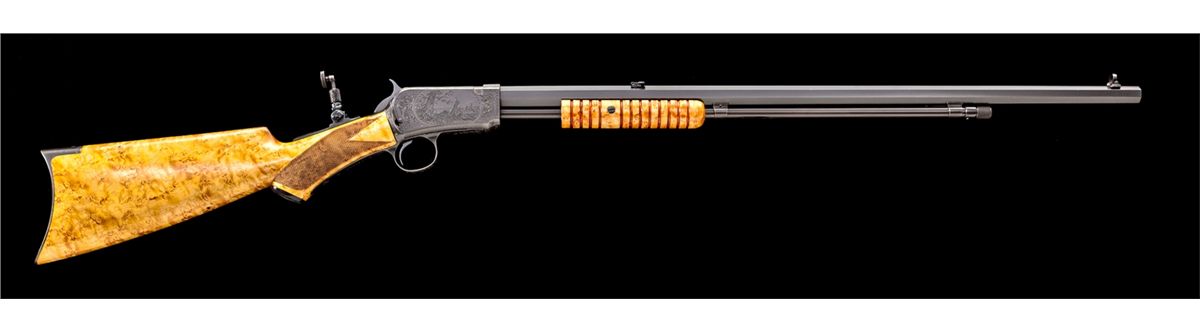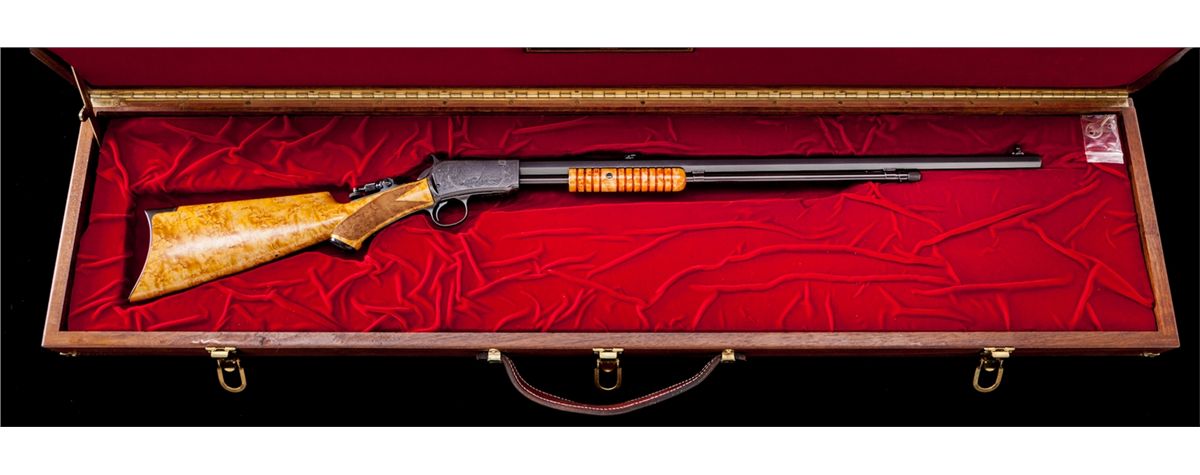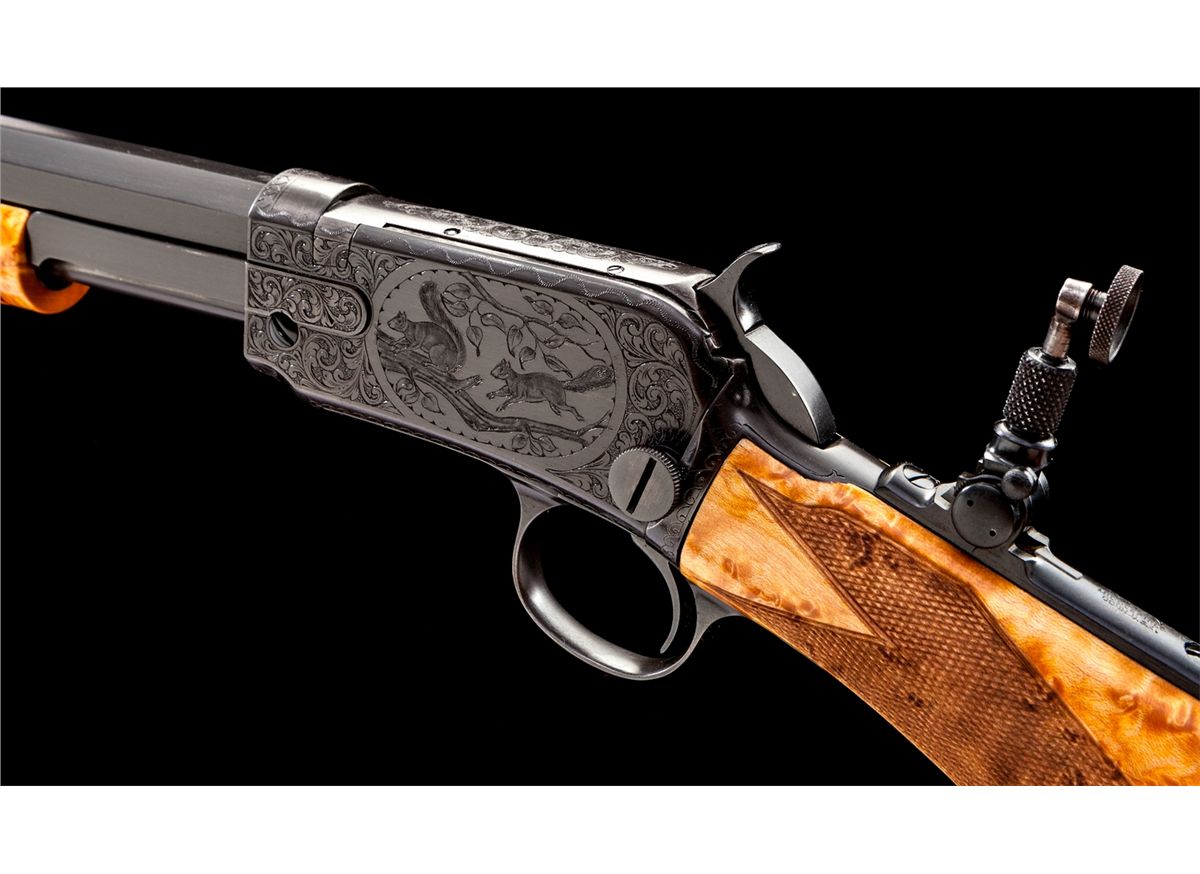 Angelo Bee Engraved Deluxe Winchester Model 90 Pump Action Rifle, in custom red velvet-lined walnut case, #749822, .22 LR cal., 24'' octagonal barrel, Lyman rear tang sight, blue combination beech type front sight, custom checkered pistol-grip birdseye maple stock, with factory No. 8 pattern style engraving showing foliate and wildlife squirrel scene on left side of frame; right side with jackrabbits in a pasture. Originally mfg'd 1934, and then enhanced, re-stocked, and modified in deluxe pistol-grip configuration. Condition is excellent, appearing new and unused since the time of enhancement. Case remains in excellent condition. Est.: $5,000-$7,500. (C&R