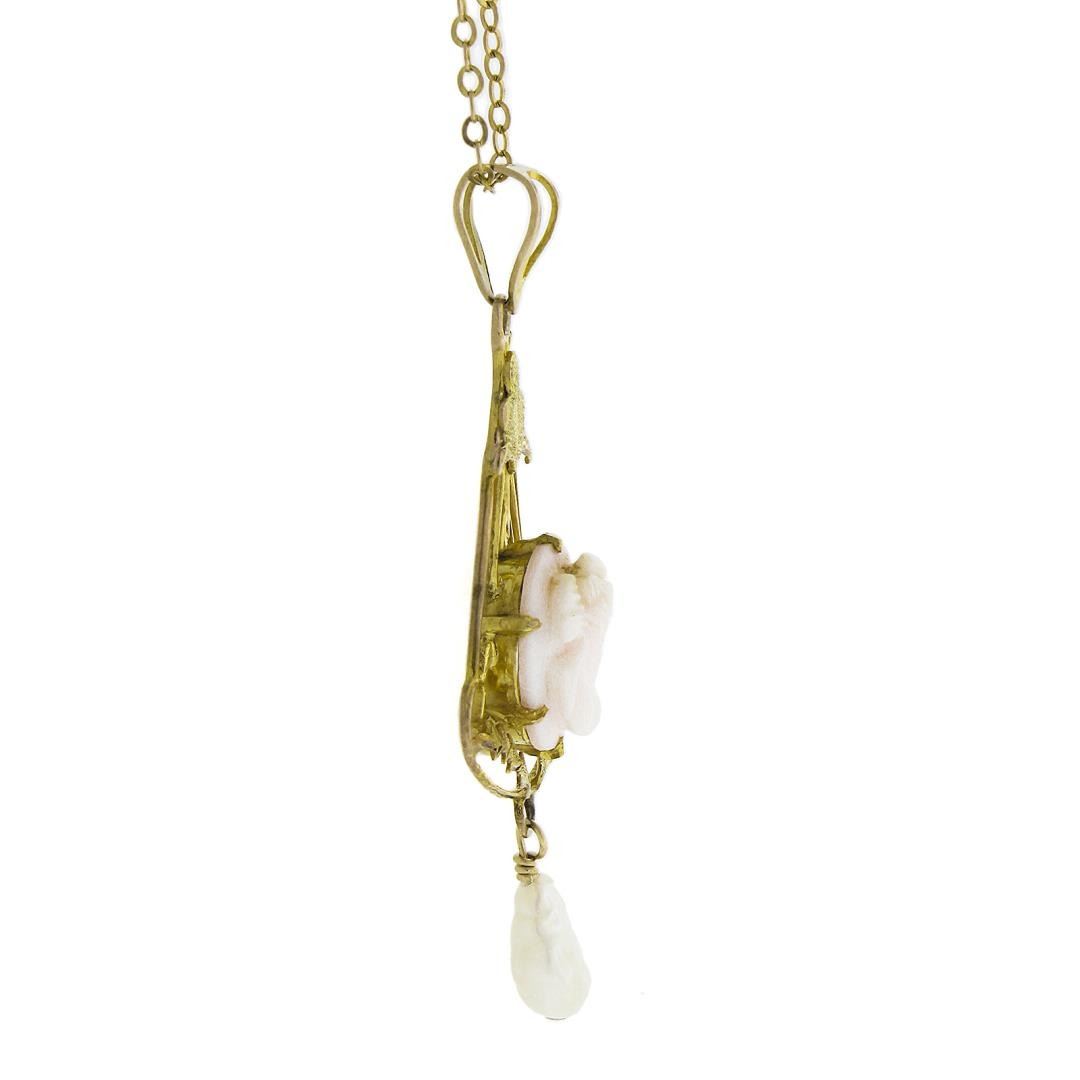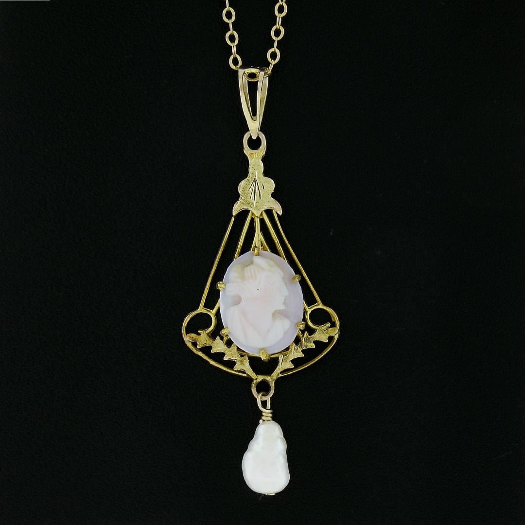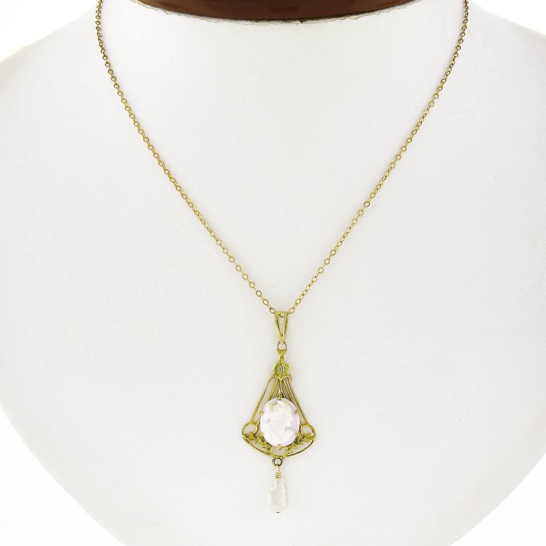 An antique solid 10k yellow & green gold pendant necklace, with oval carved cameo hardstone (10.5x8.5mm), and 1 baroque shape cultured pearl.16 inch cable link chain, 2.35 grams total weight, pendant measures 42.6x16mm.