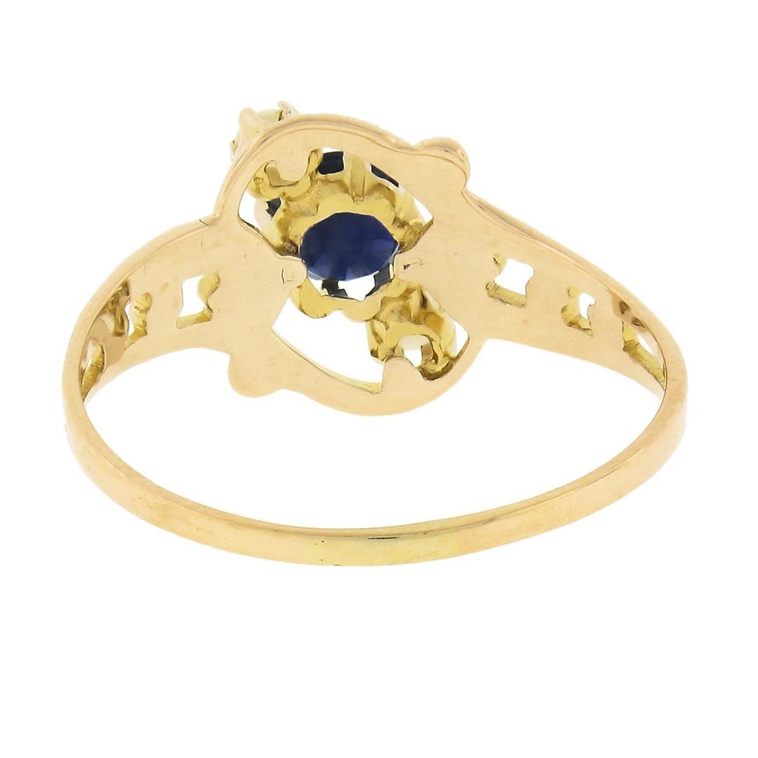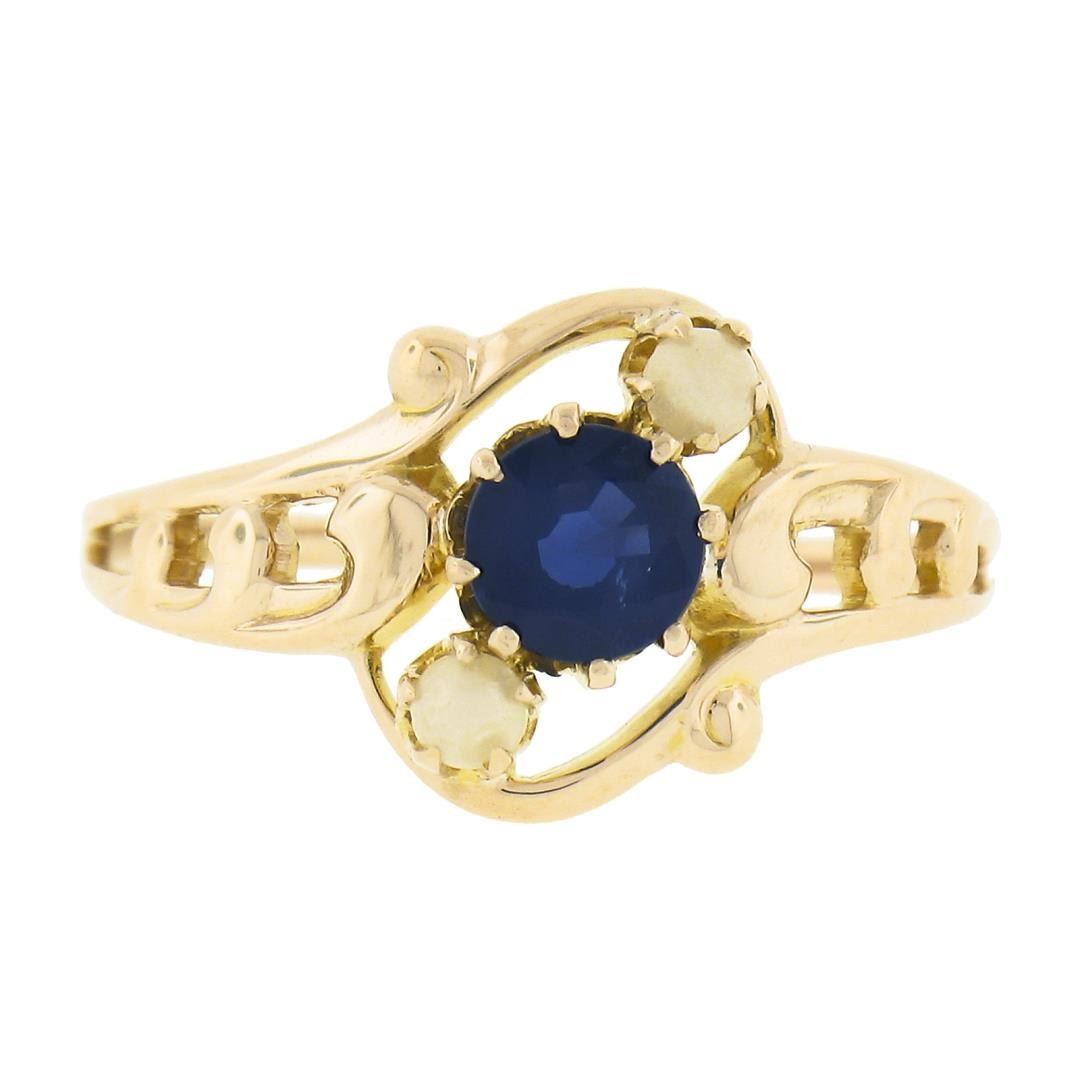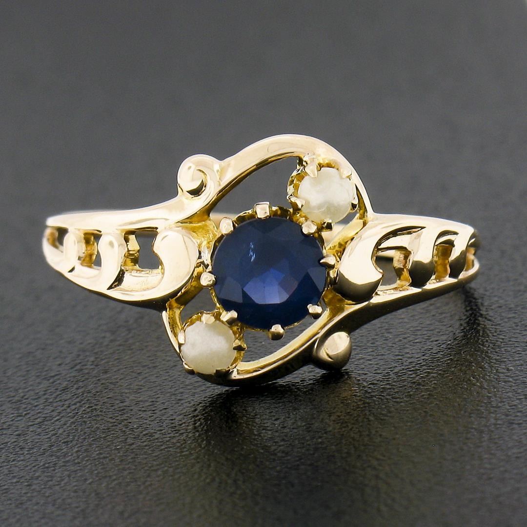 An antique solid 10k rosy yellow gold ring by Ostby & Barton Co. featuring 1 round cut natural sapphire (0.50ct), and 2 round shape cultured pearls (2.7mm each). The ring is size 6.5, weighs a total of 1.48 grams, and measures 10.6mm wide.