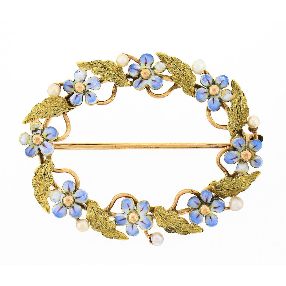 An antique solid 14k yellow gold and enamel wotk floral brooch, with 7 round shape cultured seed pearls (2.3mm each). Measures 29.40x37.10mm and weighs a total of 4.92 grams.