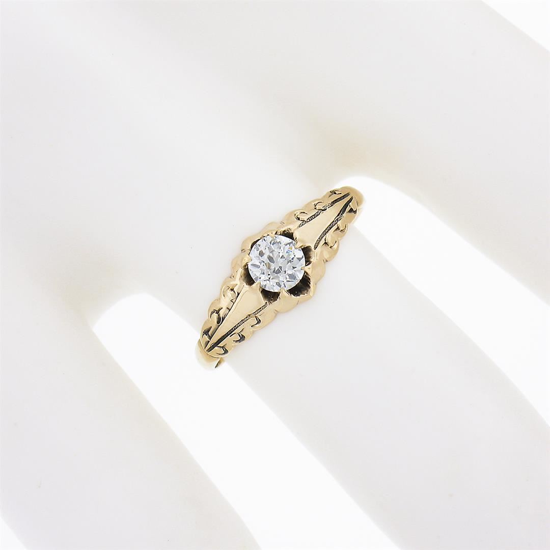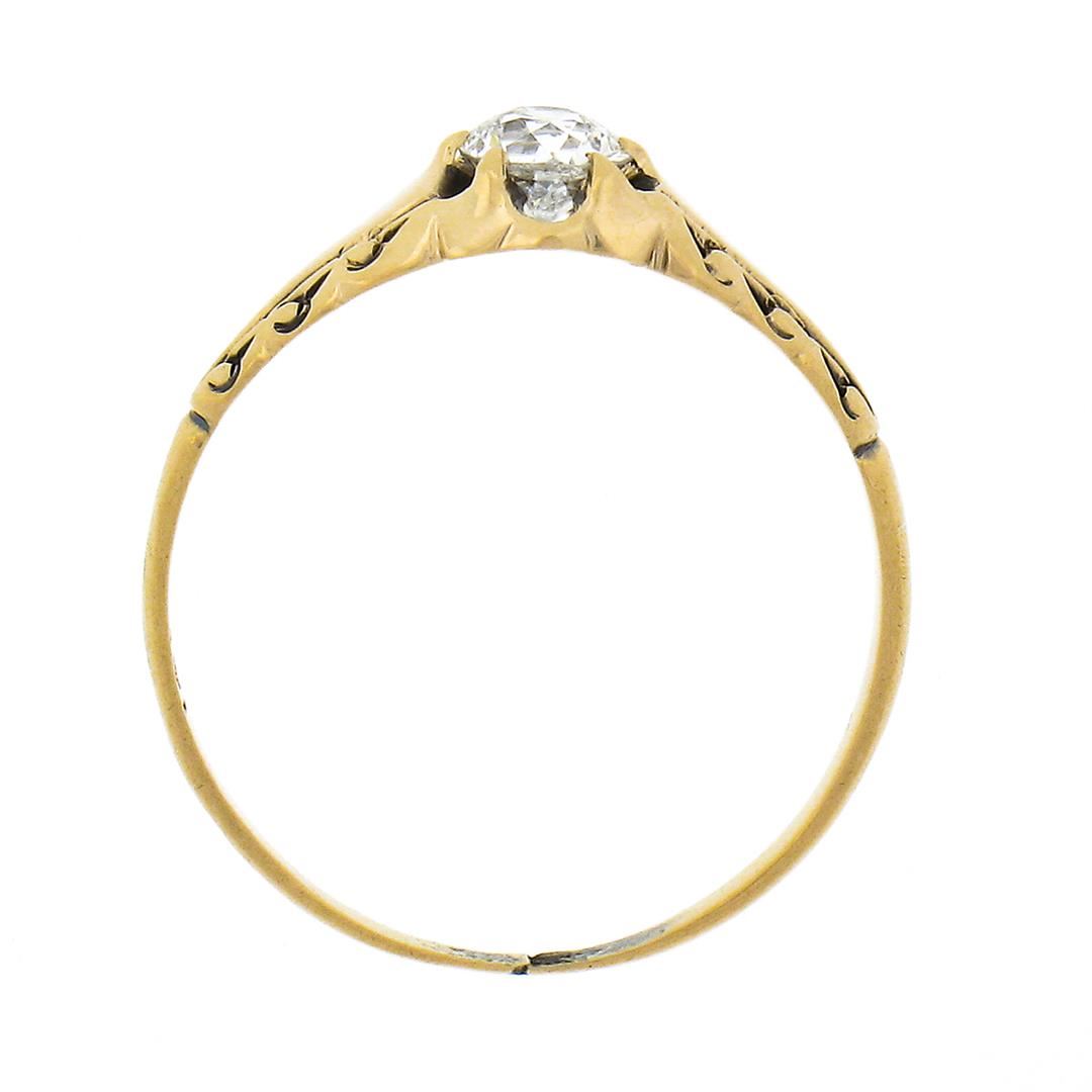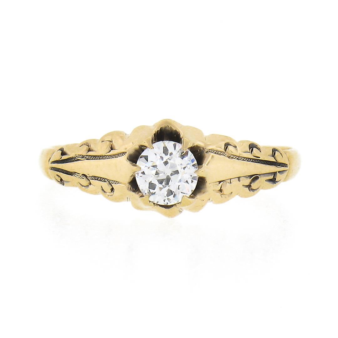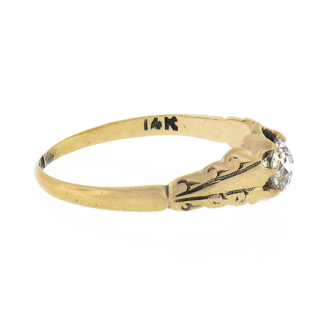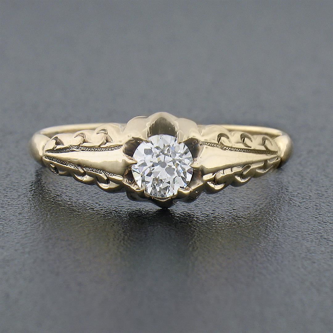 An antique solid 14k yellow gold engagement ring, with 1 old european cut natural diamond (G - SI1 ; 0.30ct). The ring is size 5.5, weighs a total of 1.23 grams, and measures 6.30mm wide.