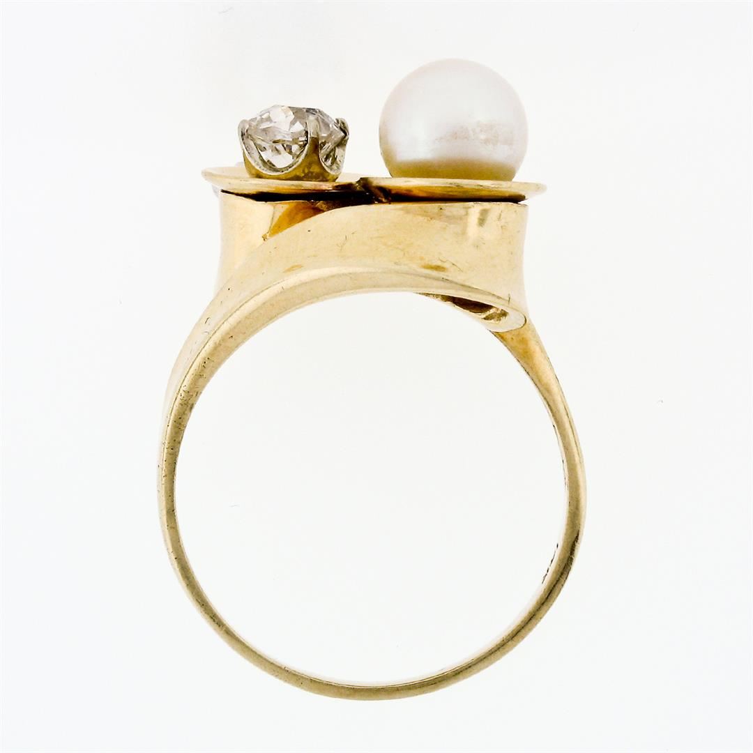 An antique solid 14k yellow gold bypass cocktail ring with 1 cultured pearl (7.2mm) and 1 natural diamond (G - SI1; 0.58ctw). The ring is size 8.5, weighs a total of 6.02 grams, and measures 15mm wide.