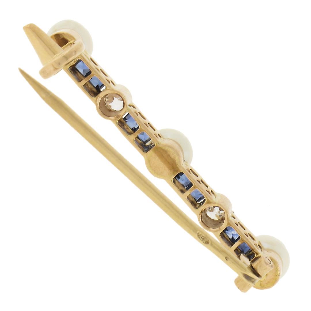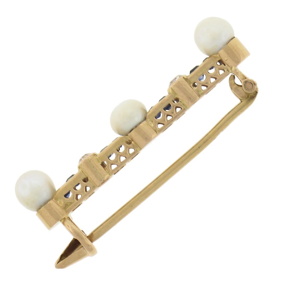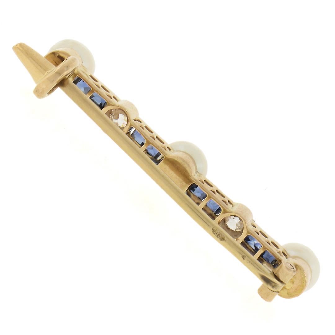 An antique solid 14k rosy yellow gold bar brooch, with 8 step cut natural sapphire, 3 round shape cultured pearls (4.6mm to 5mm each), and 2 old european cut natural diamonds ( I/J - VS2-SI2 ; 0.10ctw ). Measures 5x34.7mm and weighs a total of 3.31 grams.