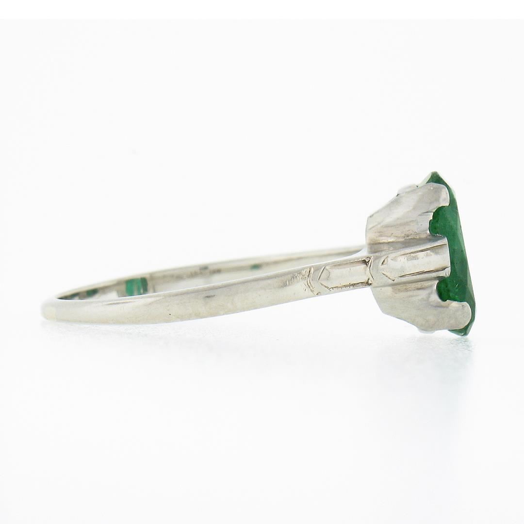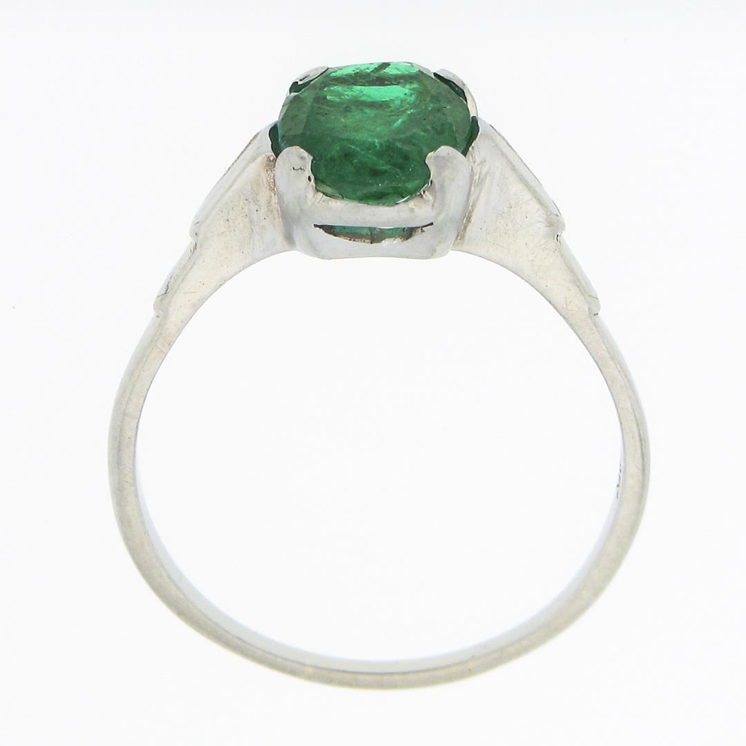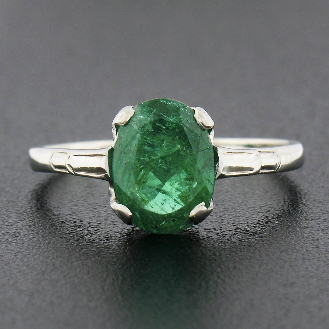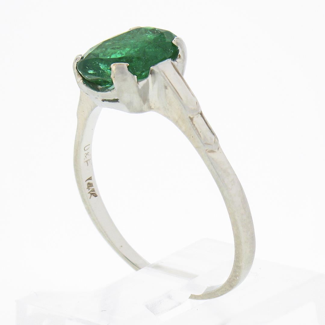 An antique solid 14k white gold solitaire ring, with 1 oval cut natural emerald (1.64ct ). The ring is size 7.5, weighs a total of 2.48 grams, and measures 9.25mm wide.