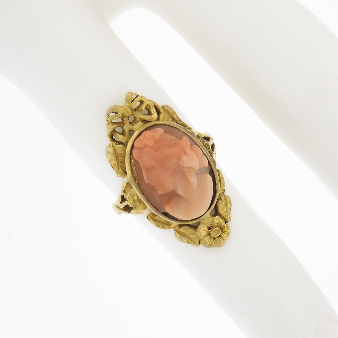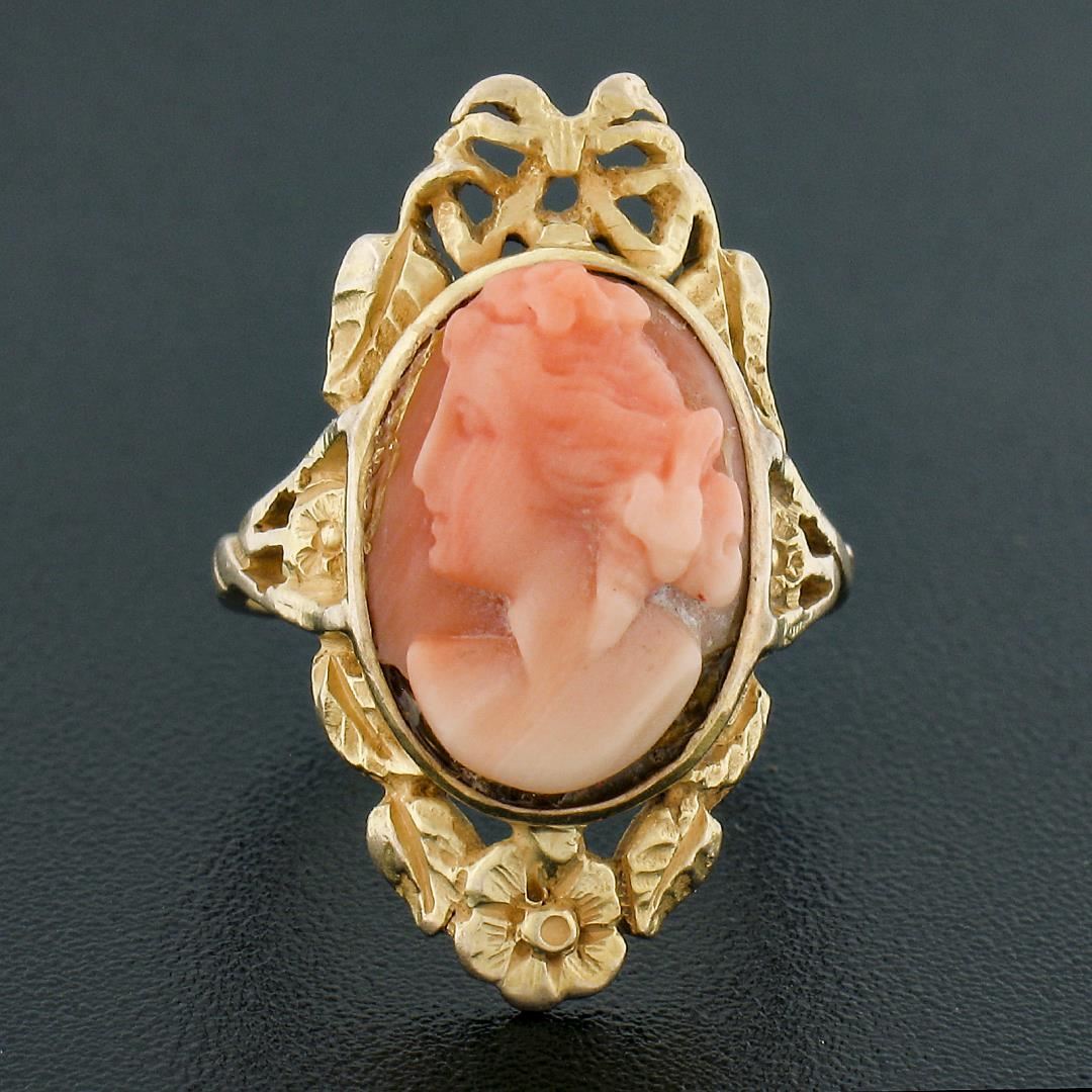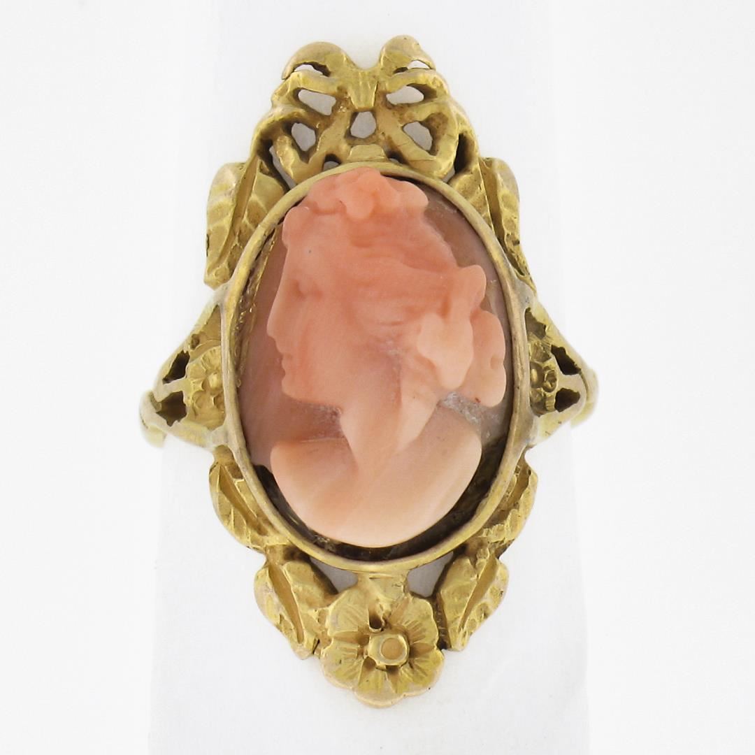 An antique solid 14k yellow gold ring, with oval cut natural carved cameo coral (12.4x9mm). The ring is size 3.5, weighs a total of 3.23 grams, and measures 22.8mm wide.