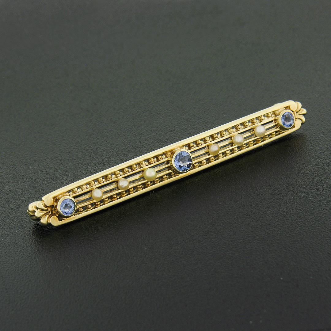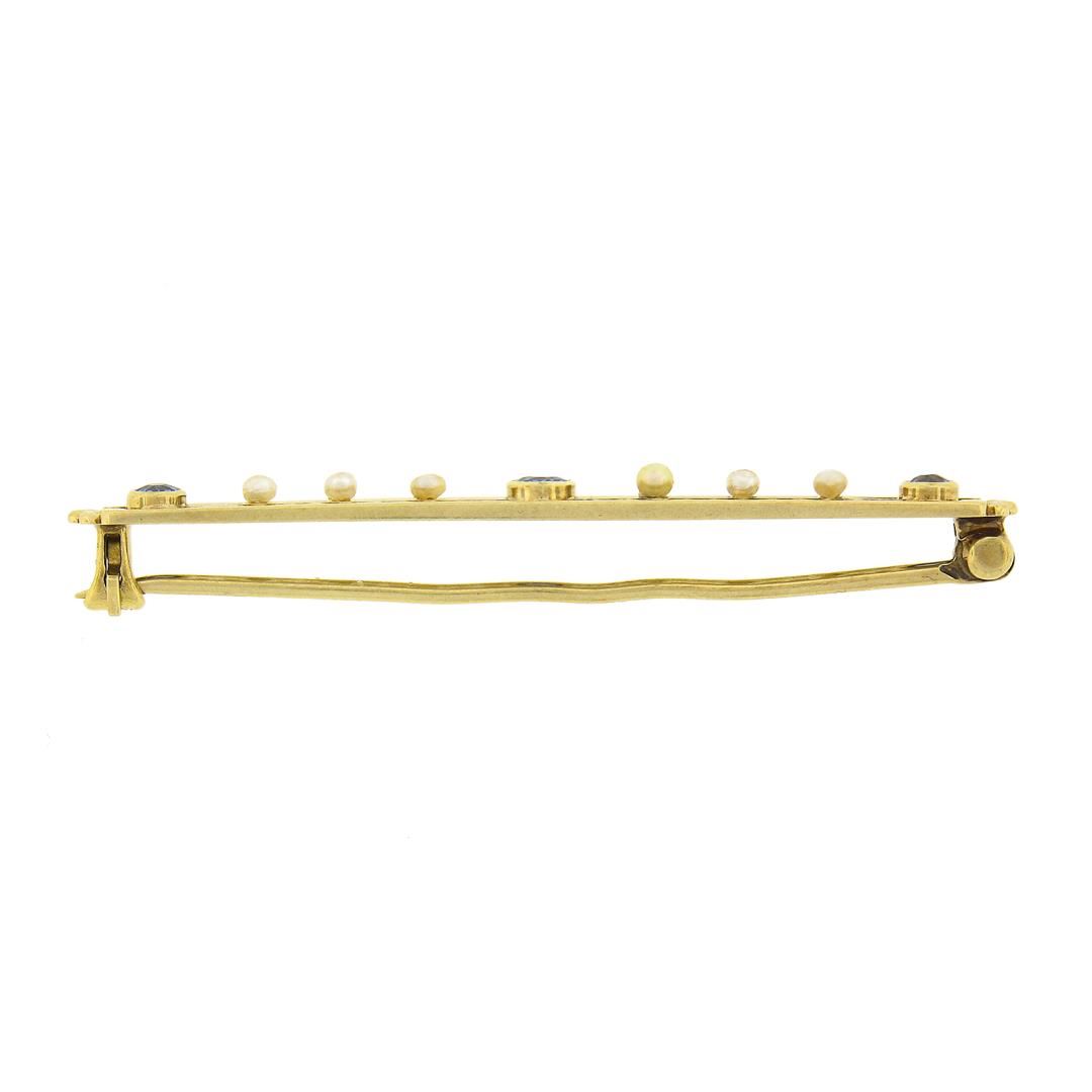 An antique solid 14k yellow gold bar brooch, with 6 round shape cultured seed pearls (1.8-2.0mm each), and 3 old round cut natural sapphires (0.25ctw). Measures 49.50x5.4mm and weighs a total of 3.48 grams.