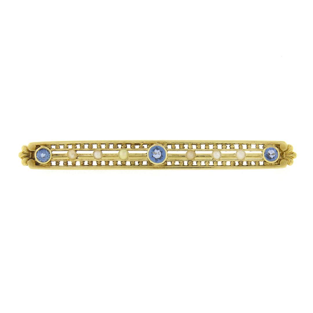 An antique solid 14k yellow gold bar brooch, with 6 round shape cultured seed pearls (1.8-2.0mm each), and 3 old round cut natural sapphires (0.25ctw). Measures 49.50x5.4mm and weighs a total of 3.48 grams.