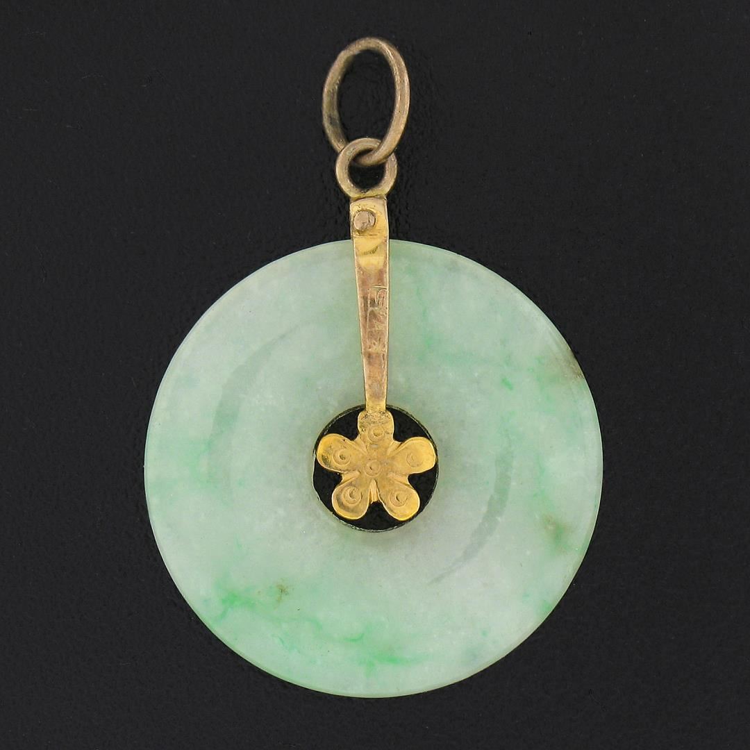 An antique 9k yellow gold medalion pendant, featuring round desk natural jade. The pendant weighs a total of 1.63 grams, measures 26.9x18.8mm including the bail, and the inside of the bail measures 3.2x4mm.