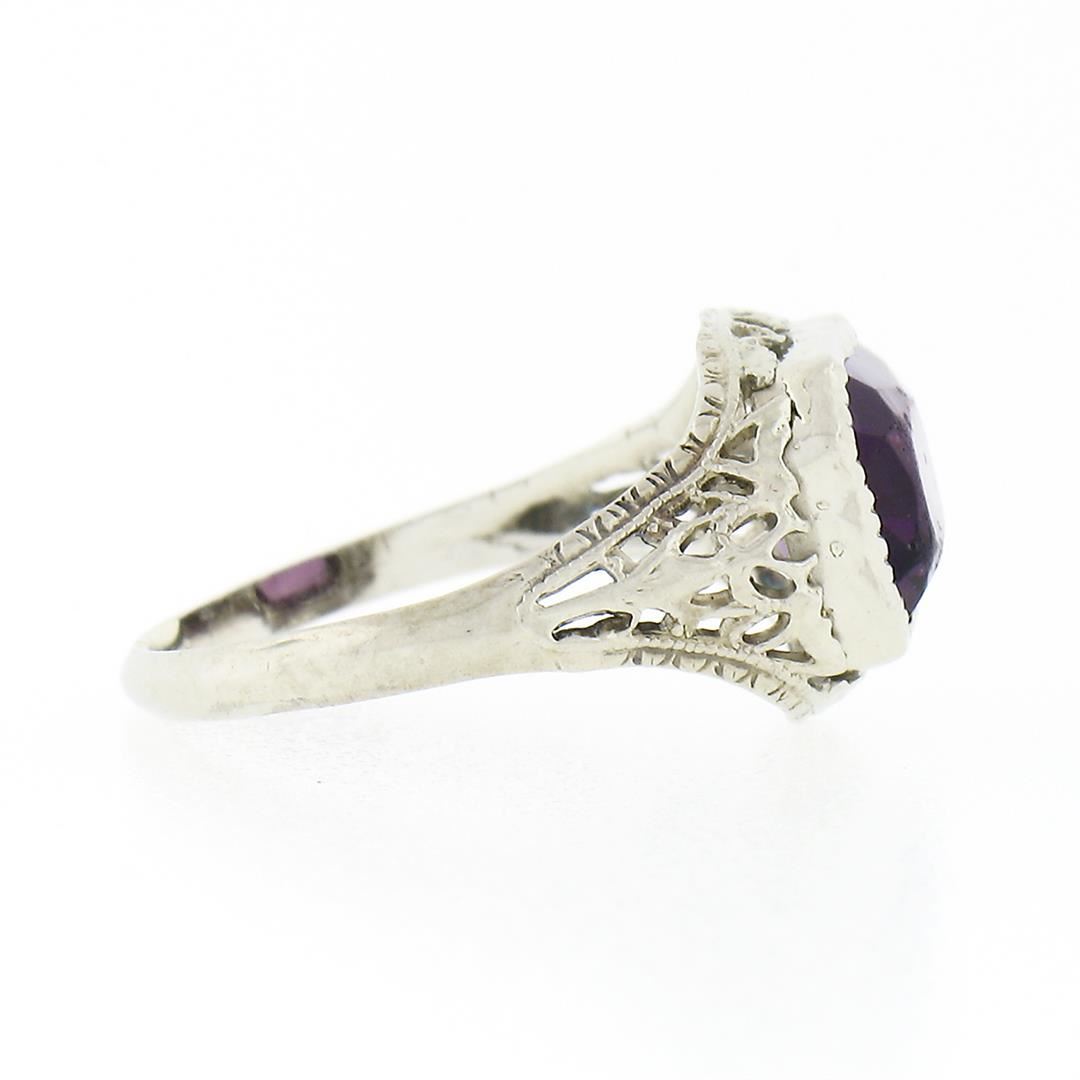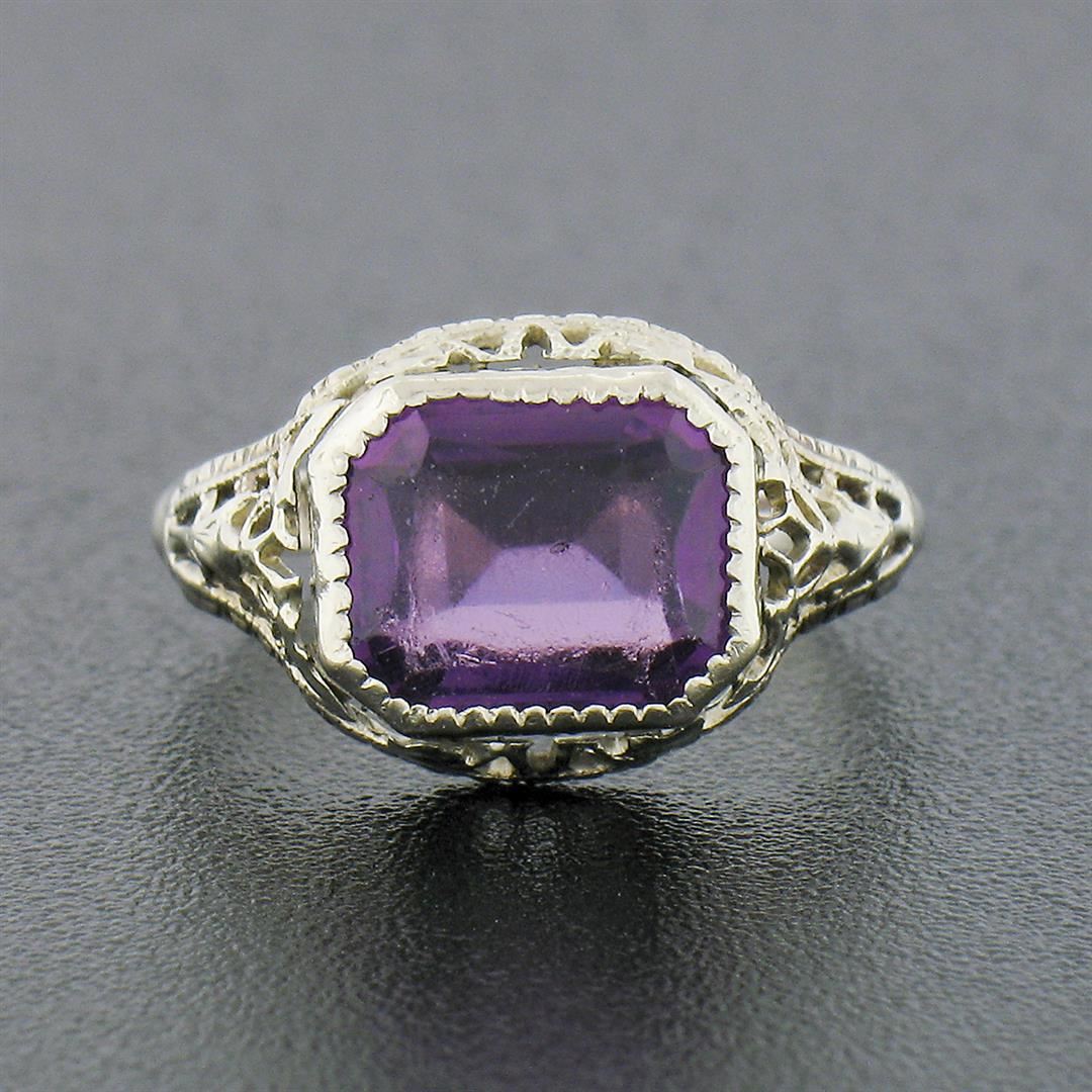 An antique art deco solid 10k white gold solitaire ring, with 1 custom cut natural amethyst (7.4x5.7mm). The ring is size 3.0, weighs a total of 1.18 grams, and measures 9.1mm wide.