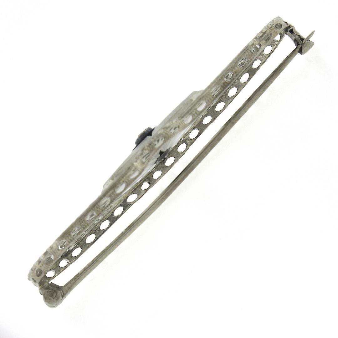An antique solid 14k white gold brooch, with 1 single cut natural diamond (0.03ct), and 1 disk cut natural black onyx (5.5mm). Measures 18.3x45.9mm and weighs a total of 4.14 grams.