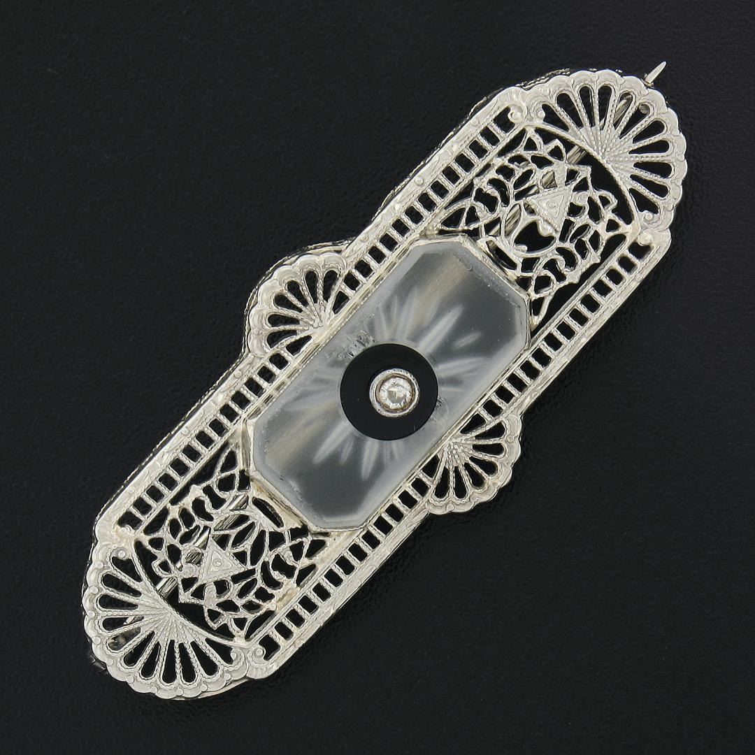 An antique solid 14k white gold brooch, with 1 single cut natural diamond (0.03ct), and 1 disk cut natural black onyx (5.5mm). Measures 18.3x45.9mm and weighs a total of 4.14 grams.