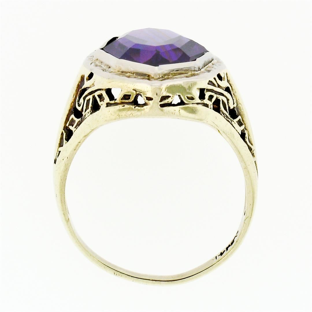 An art deco period solid 14k two tone gold solitaire ring with 1 marquise step cut natural amethyst (2.50ct). The ring is size 3.5, weighs a total of 3.16 grams, and measures 15.66mm wide.
