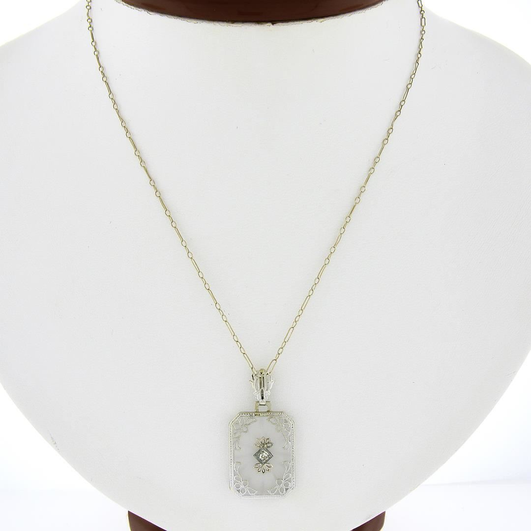 An antique solid 14k white gold pendant necklace, with 1 camphor glass & 1 single cut natural diamond (J - SI1 ; 0.03ct). 16.5 inch figaro link chain, 3.47 grams total weight, pendant measures 30.9x15.7mm.