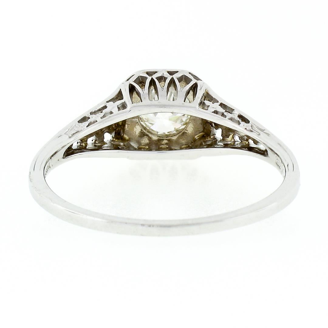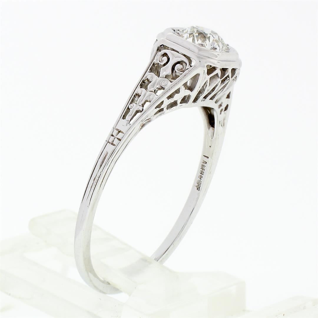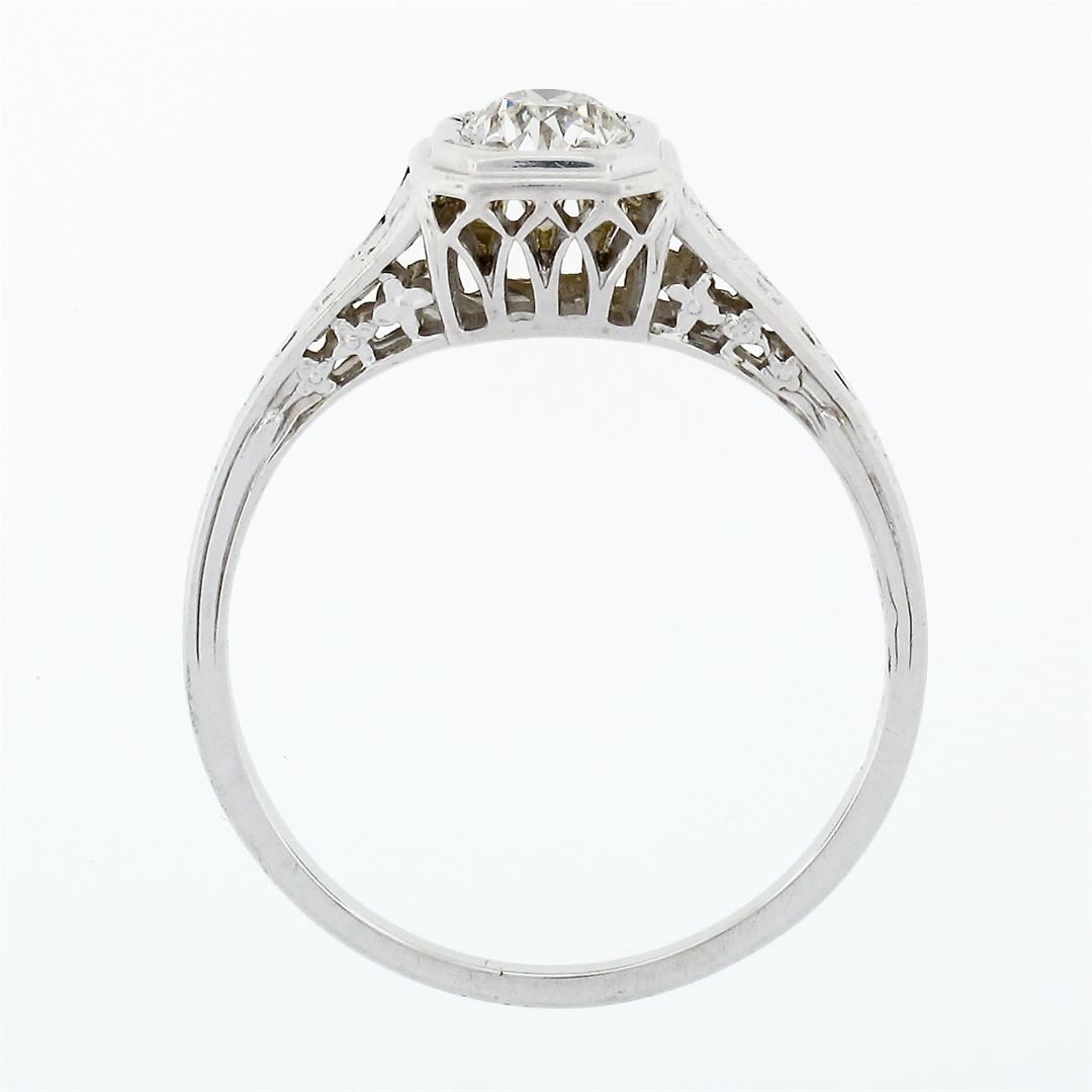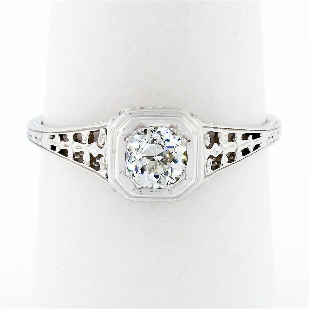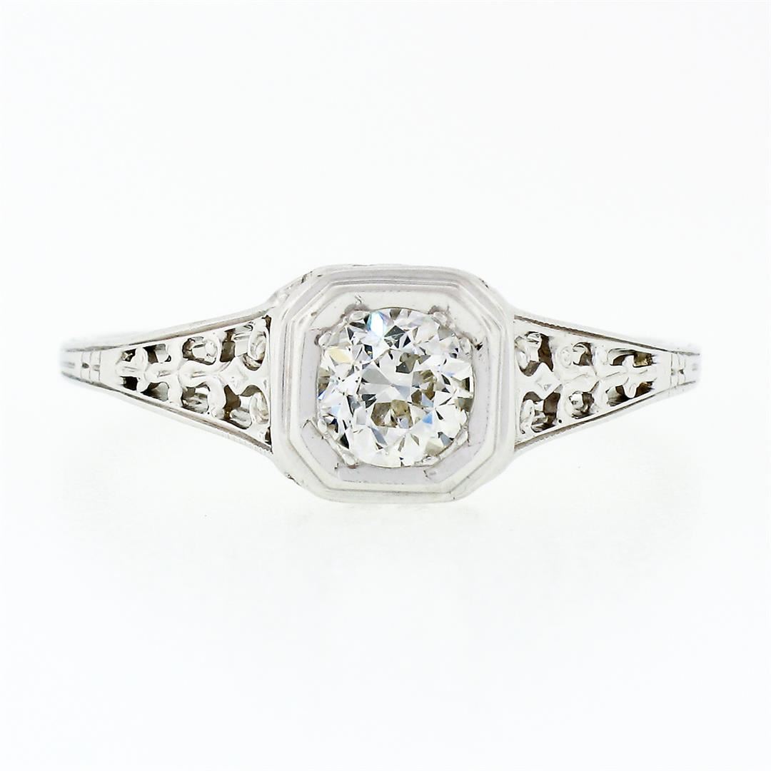 An art deco period solid 18k white gold engagement ring, with 1 old European cut natural diamond (I/J - VVS2; 0.45ct). The ring is size7.5, weighs a total of 2.29 grams, and measures 7.1mm wide.